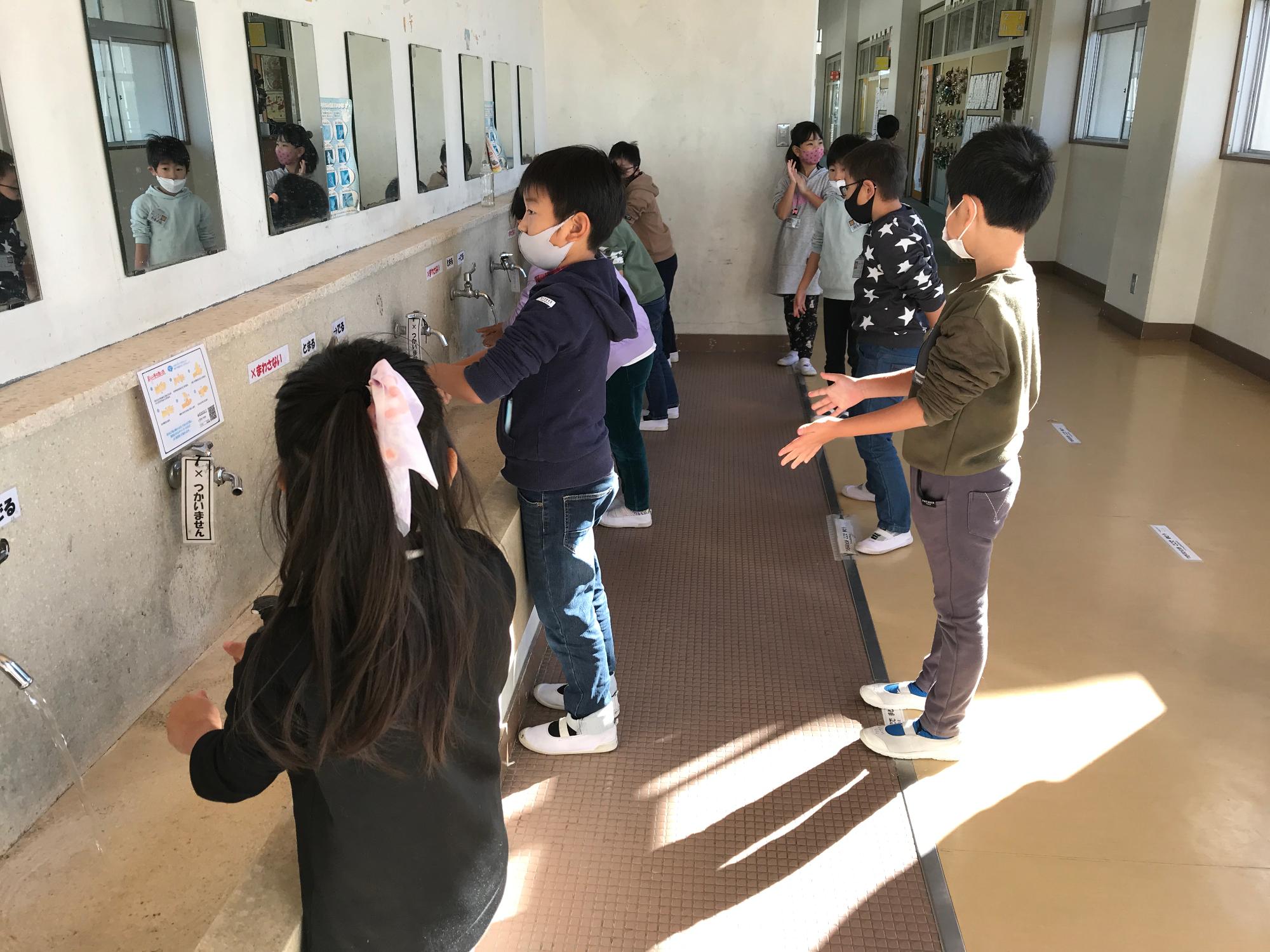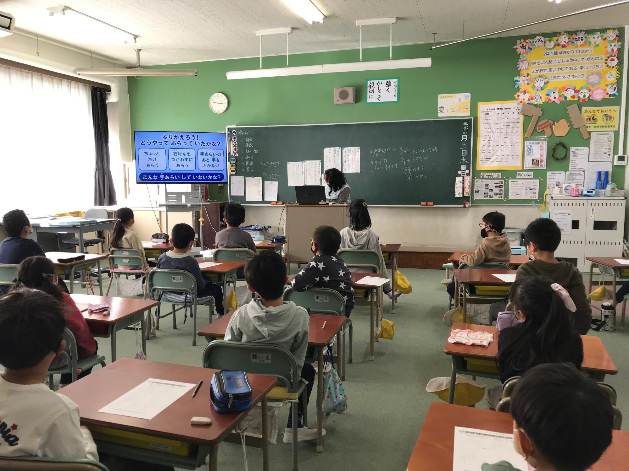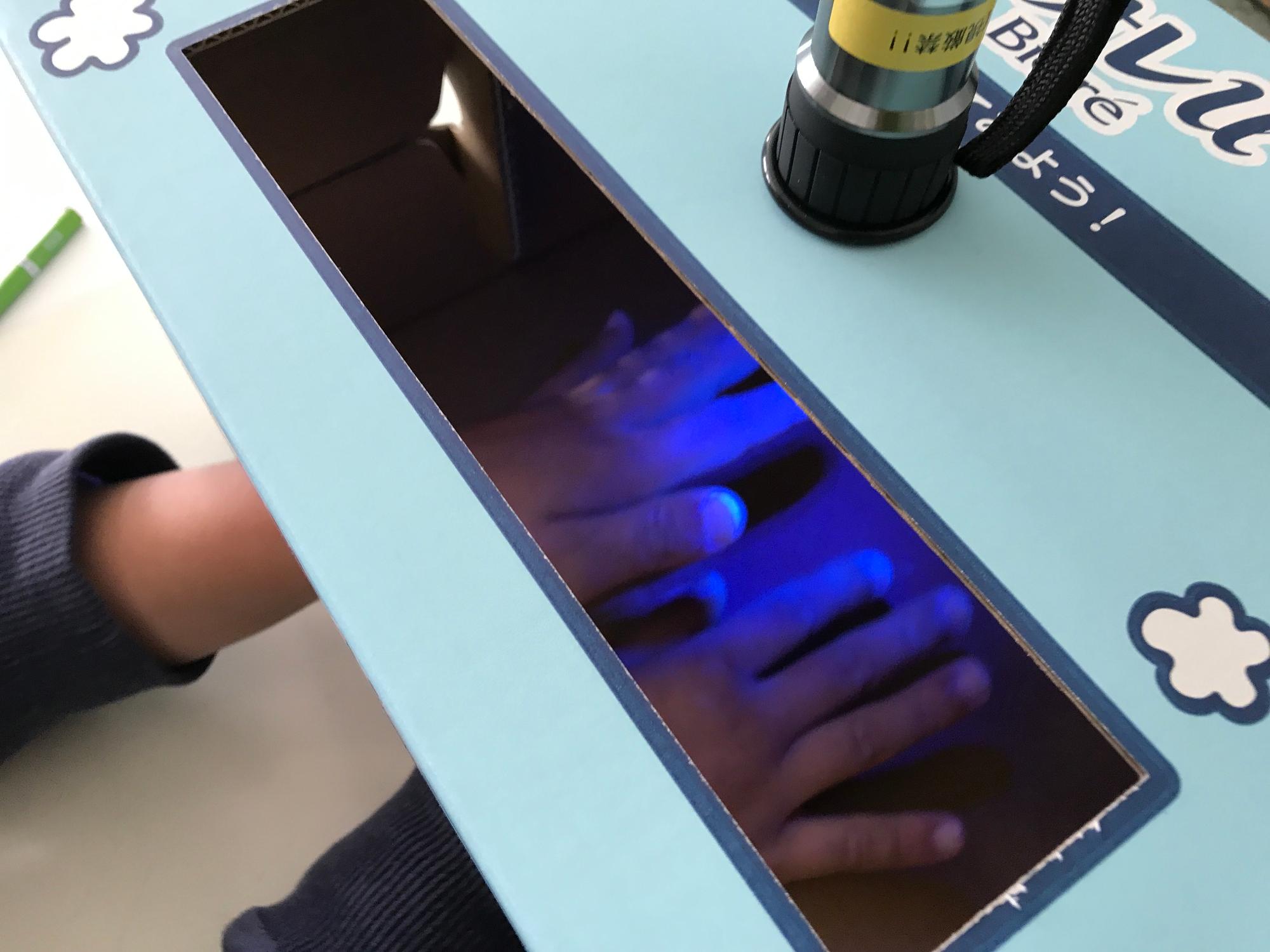 養護教諭の指導による手洗い教室。手洗いチェッカー専用ローションを手につけて、いつものように手を洗った後、特別のライトで照らしてみると・・・・。上手な手の洗い方を勉強しました。