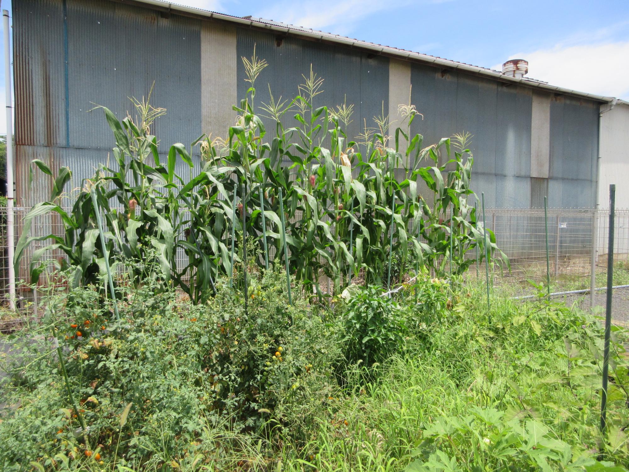 4年生が植えたヘチマのグリーンカーテン(左)、わかば・青葉学級の子たちが植えたポップコーン用トウモロコシが、すくすくと育っています。