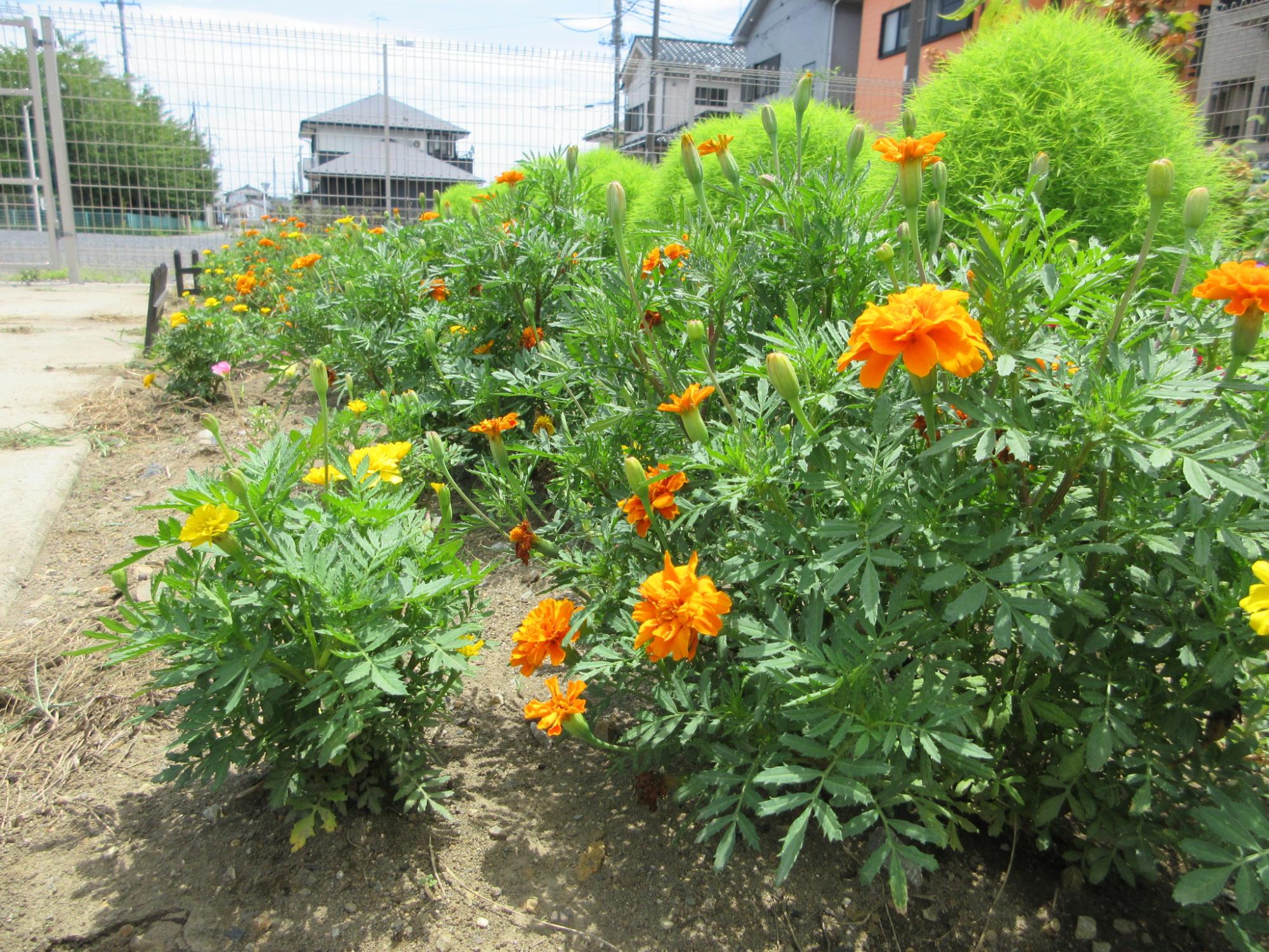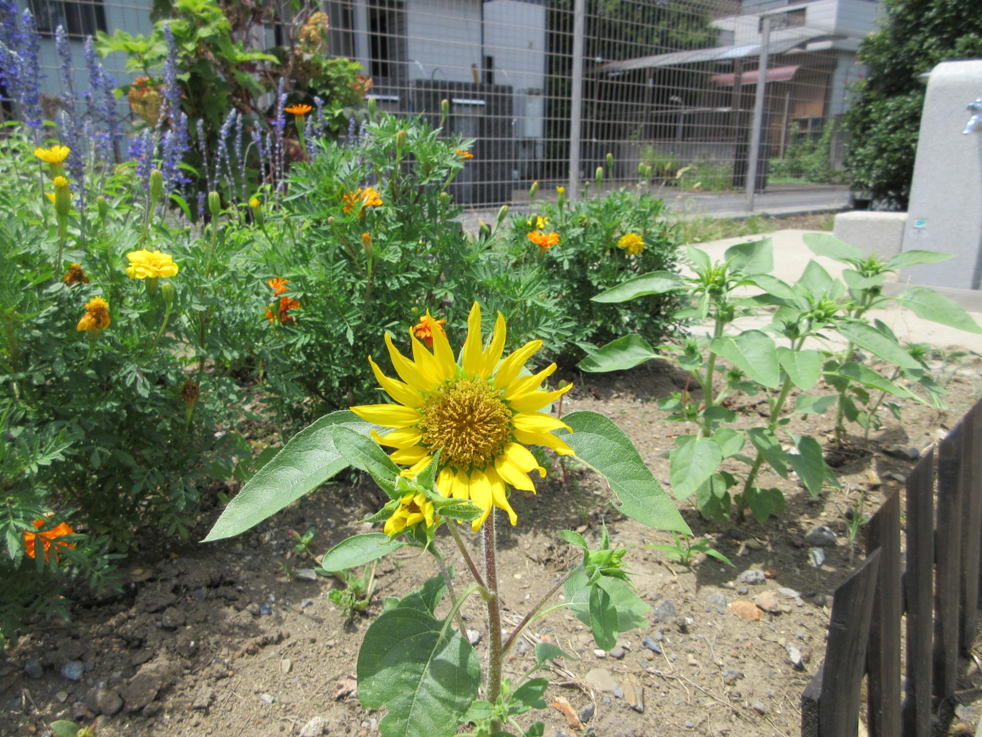 3年生が種から育てたヒマワリ(左)とマリーゴールド(右)も、花壇をきれいに彩っています。