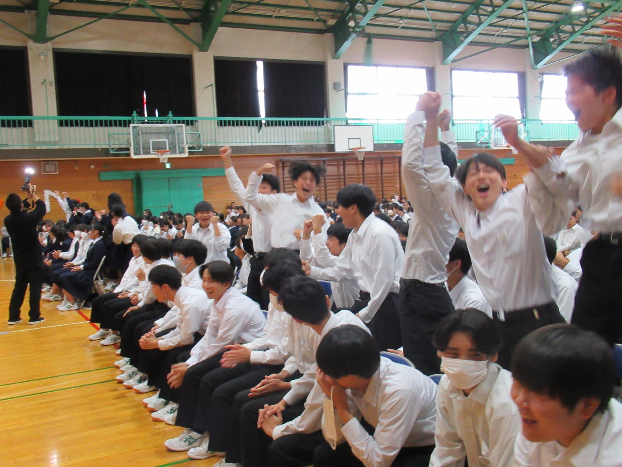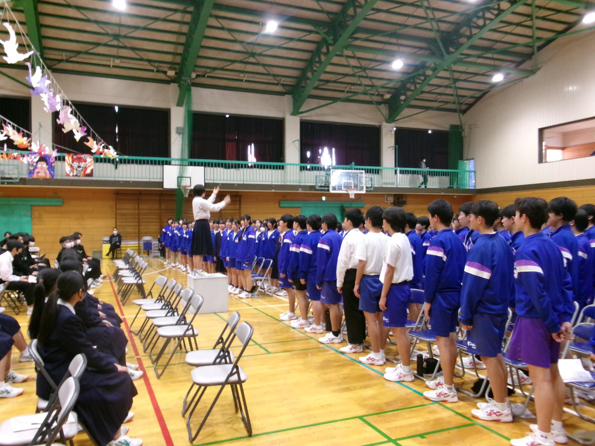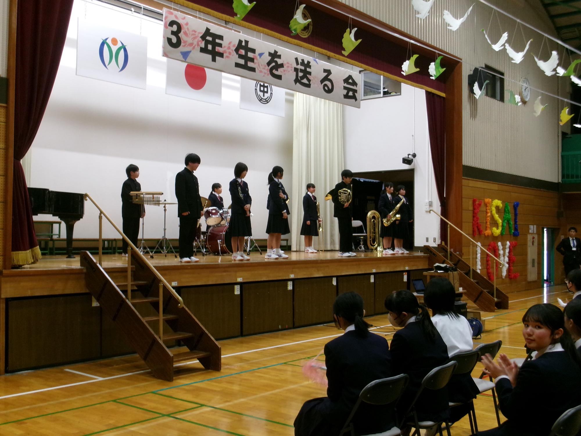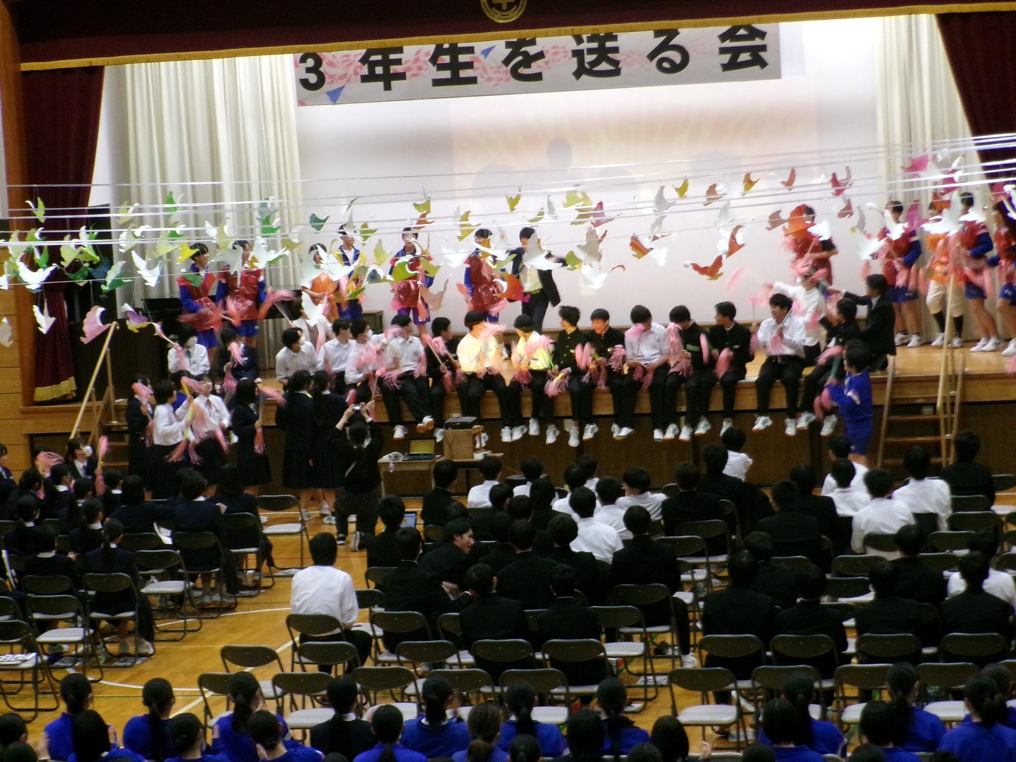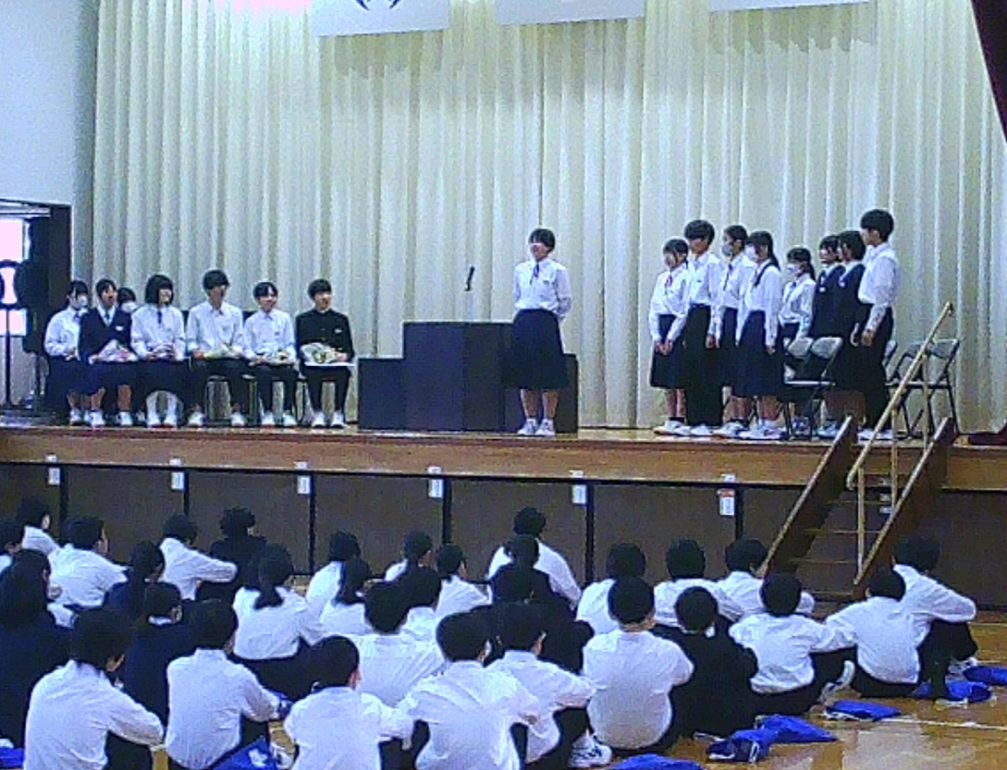 3月5日(木曜日)に「三年生を送る会」が開催されました。生徒会企画のクイズや部活動からのメッセージ、合唱などが行われ、在校生から卒業生へお祝いと感謝の気持ちを伝えました。会場は温かな雰囲気に包まれ、卒業生にとって思い出に残るひとときとなりました。