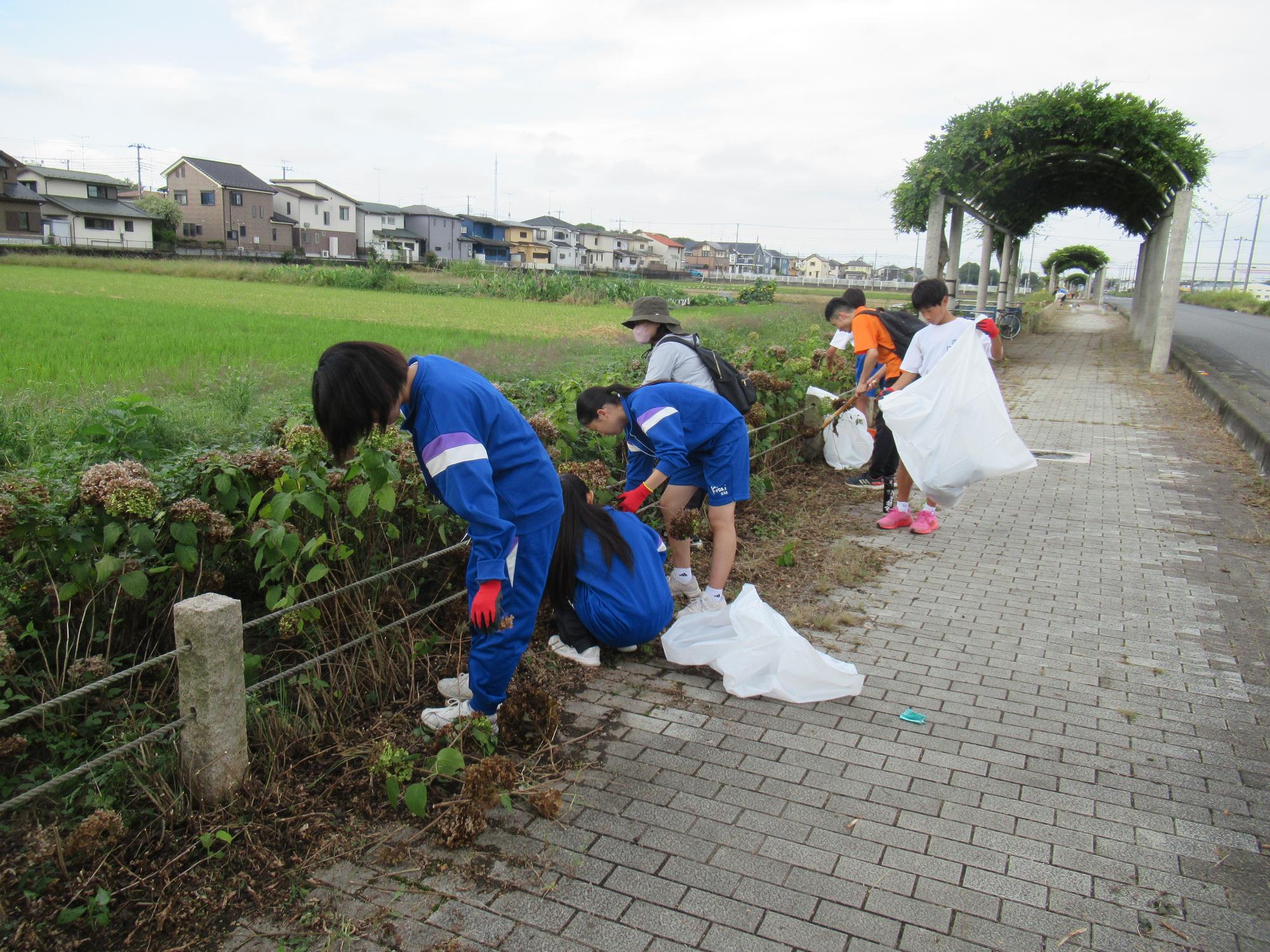 あじさいロードには、毎年6月頃、1万本のあじさいが咲き誇ります。あじさいをきれいに咲かせるためには、花の手入れを行うことが大切です。10月5日(日曜日)に、11名の生徒がボランティアとして参加し、地域の方とともにあじさいの花切作業を行いました。来年もきれいなあじさいが咲くのが楽しみです。