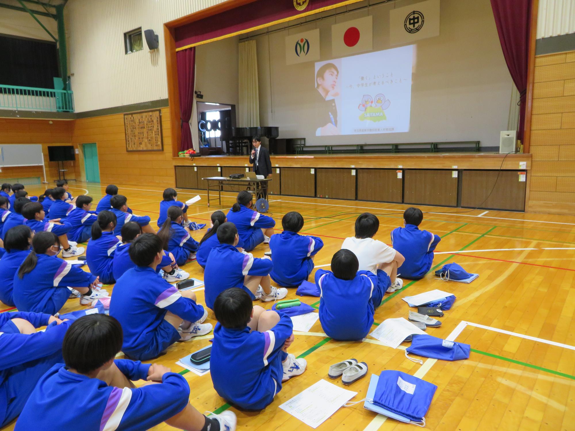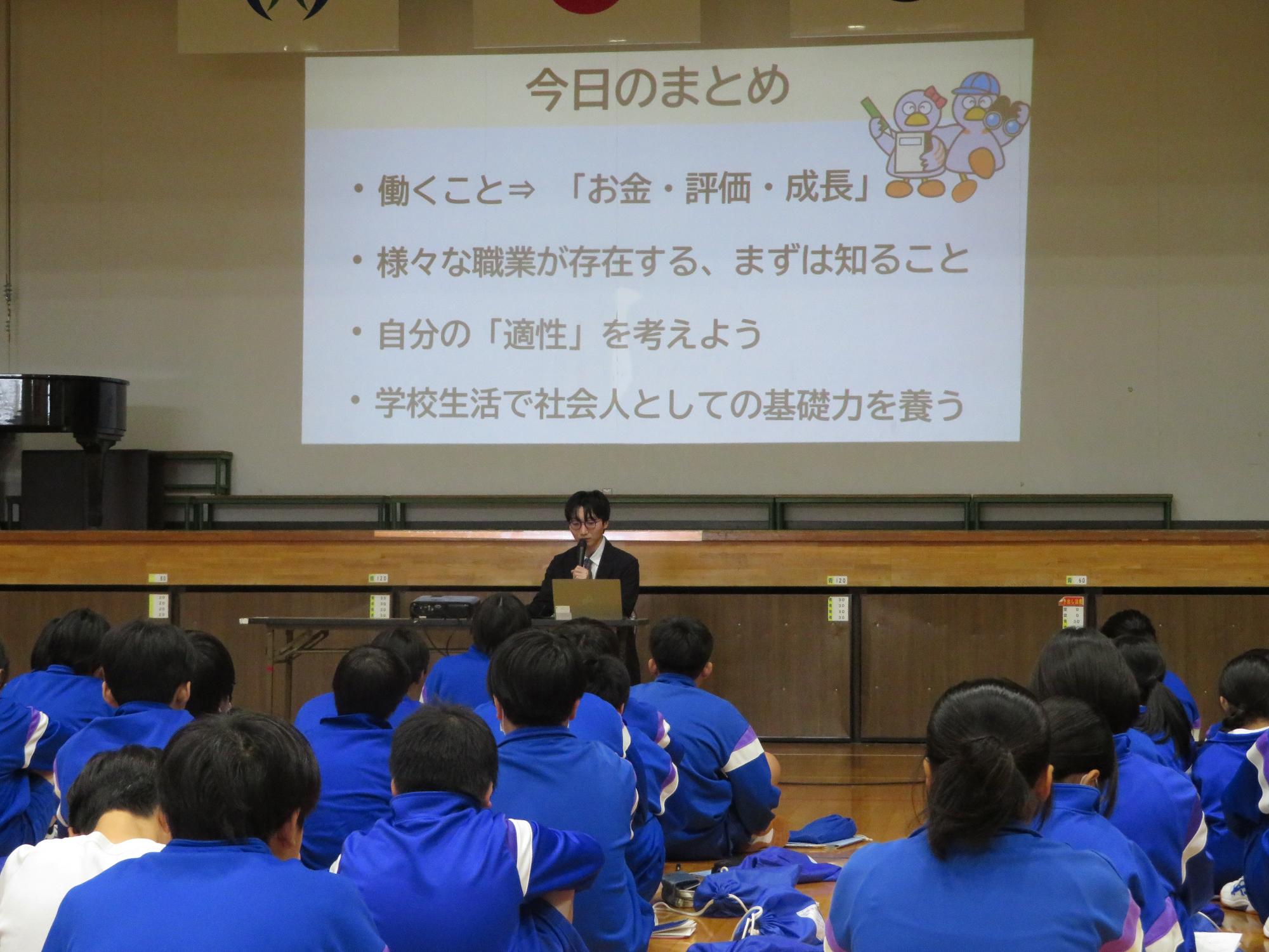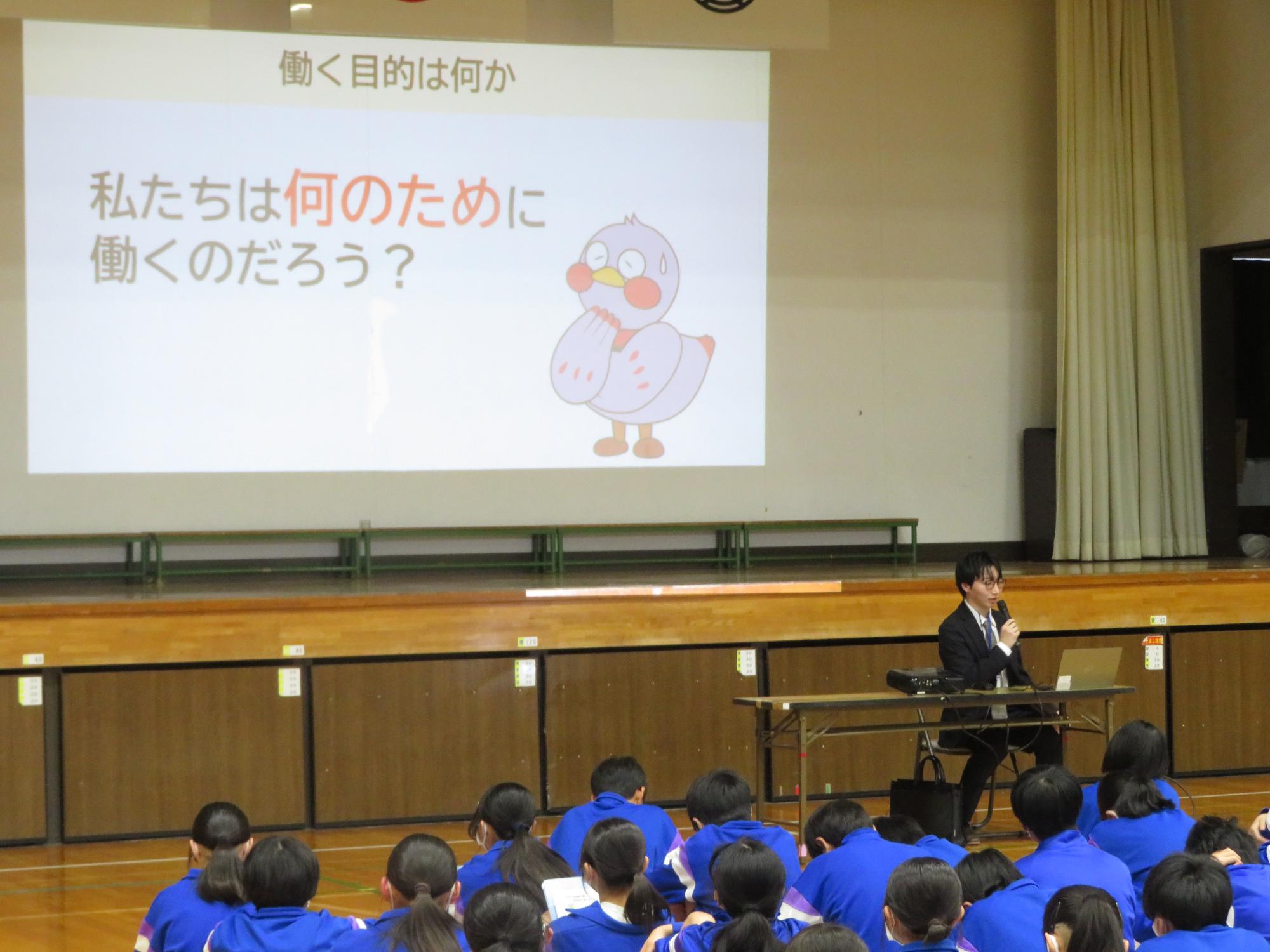 1学年の生徒を対象に、県庁職員による「はたらくこと」の意義について学ぶ出前授業を実施しました。働くことの意義や、職業の種類、職業の選び方について、中学1年生として知っておかなければならないことについて学ぶことができました。