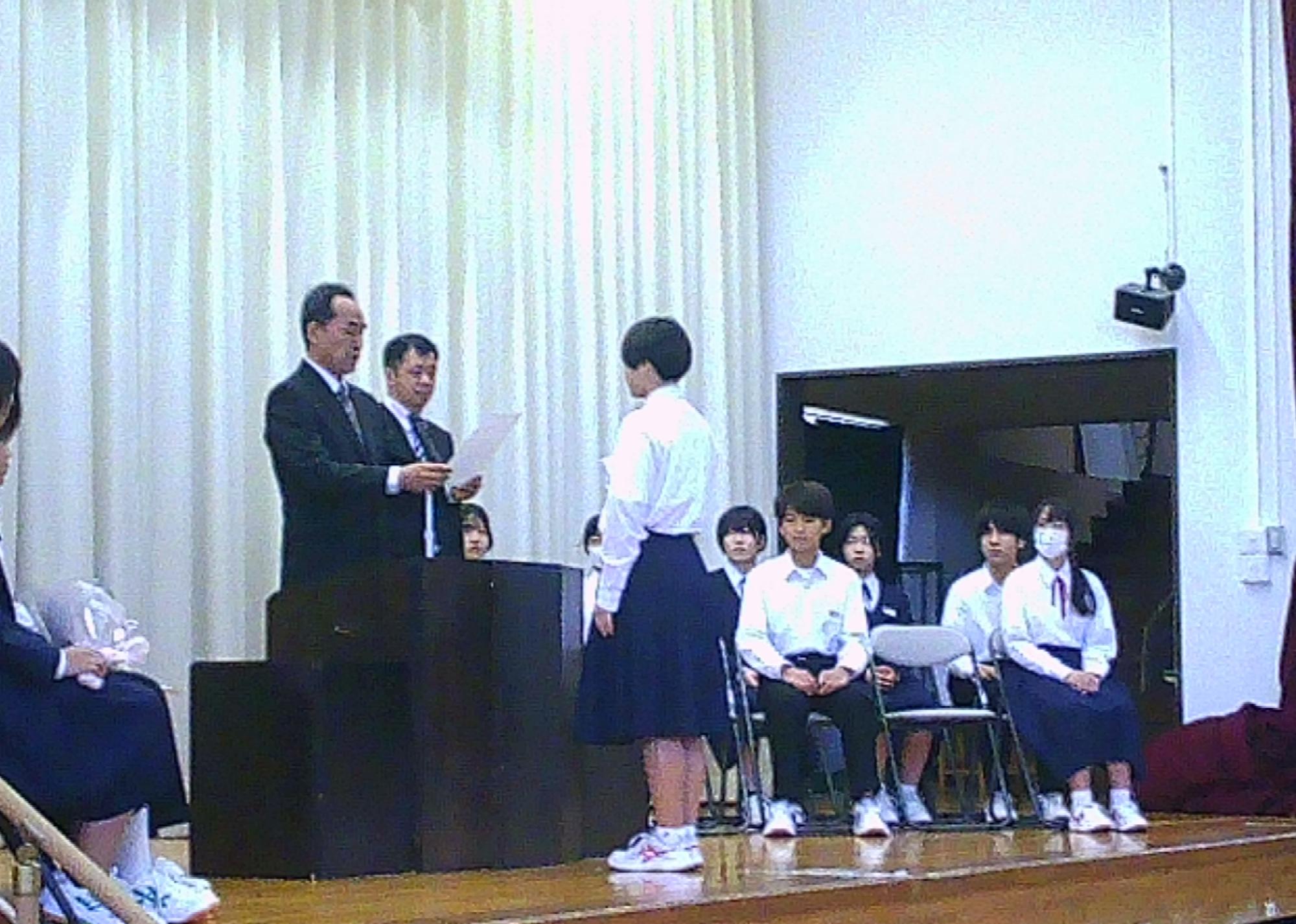 生徒会の任命式と引継ぎ式が行われました。旧生徒会本部役員の生徒には感謝状と花束が贈られ、温かい拍手と笑顔に包まれた式となりました。新しい生徒会本部役員の生徒は、やや緊張した面持ちでしたが、やる気に満ちた表情を見せていました。これからの活躍がとても楽しみです。