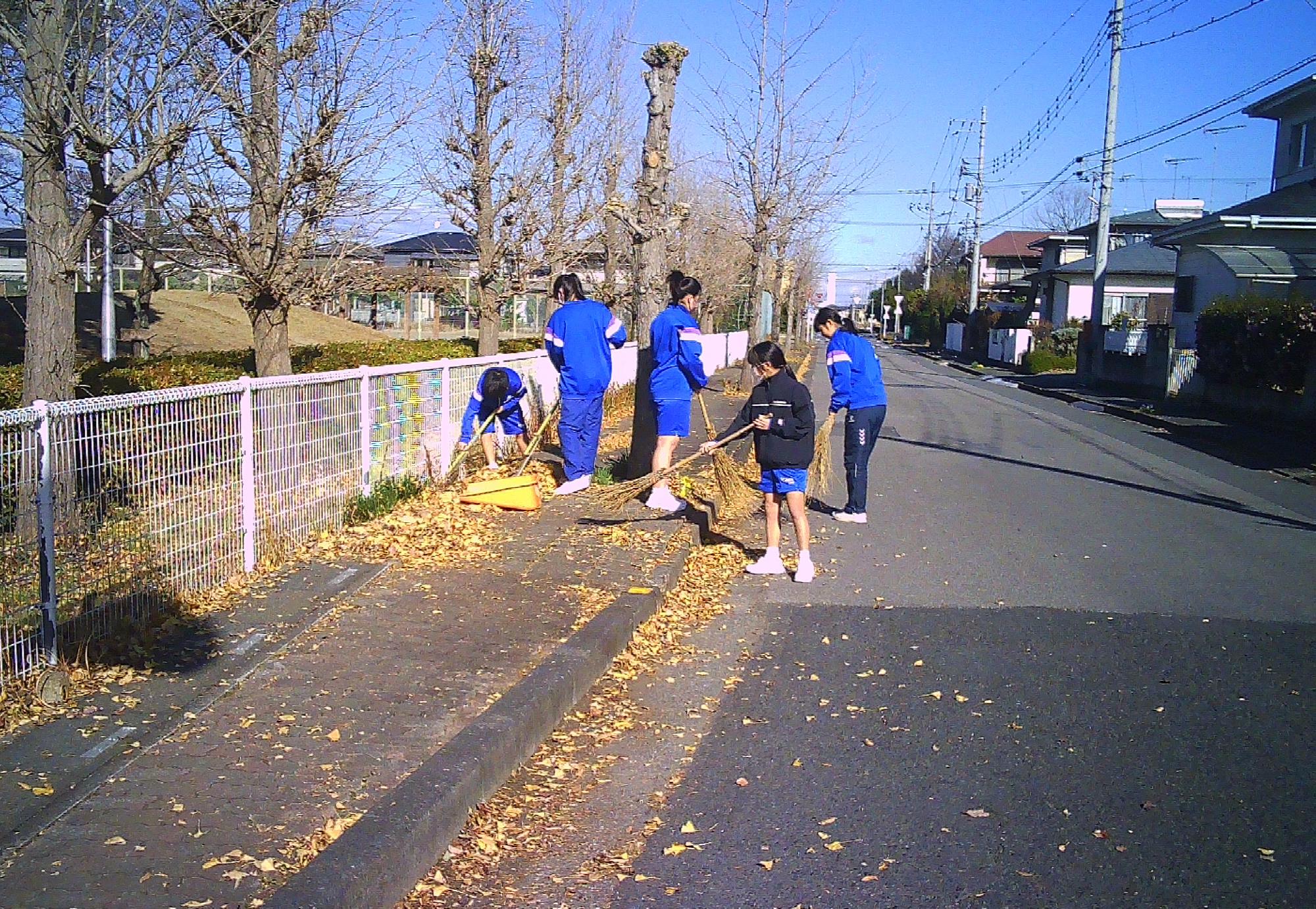 ふじの木学級の生徒が、騎西中前の歩道と公園の落ち葉掃きをしました。
