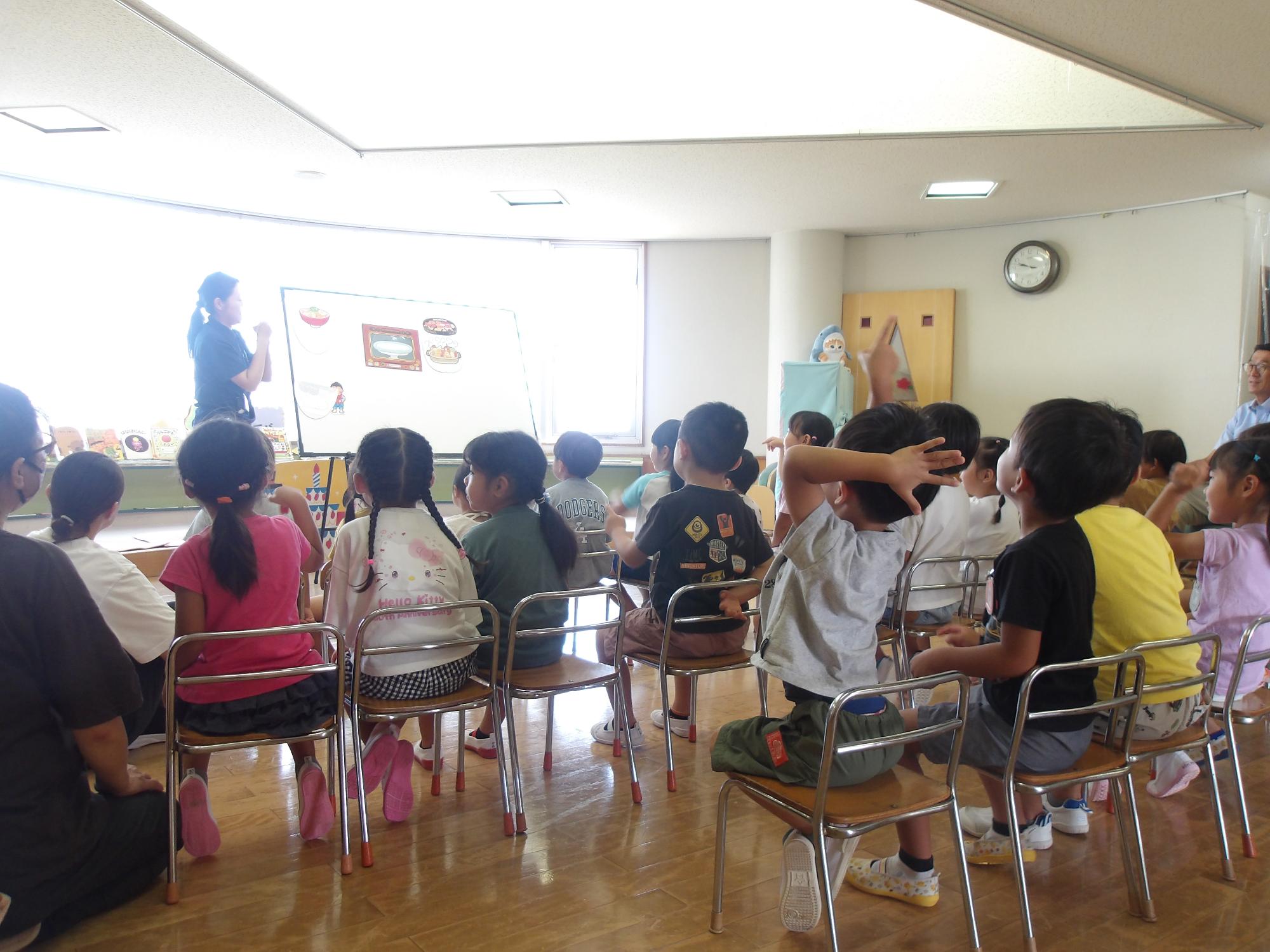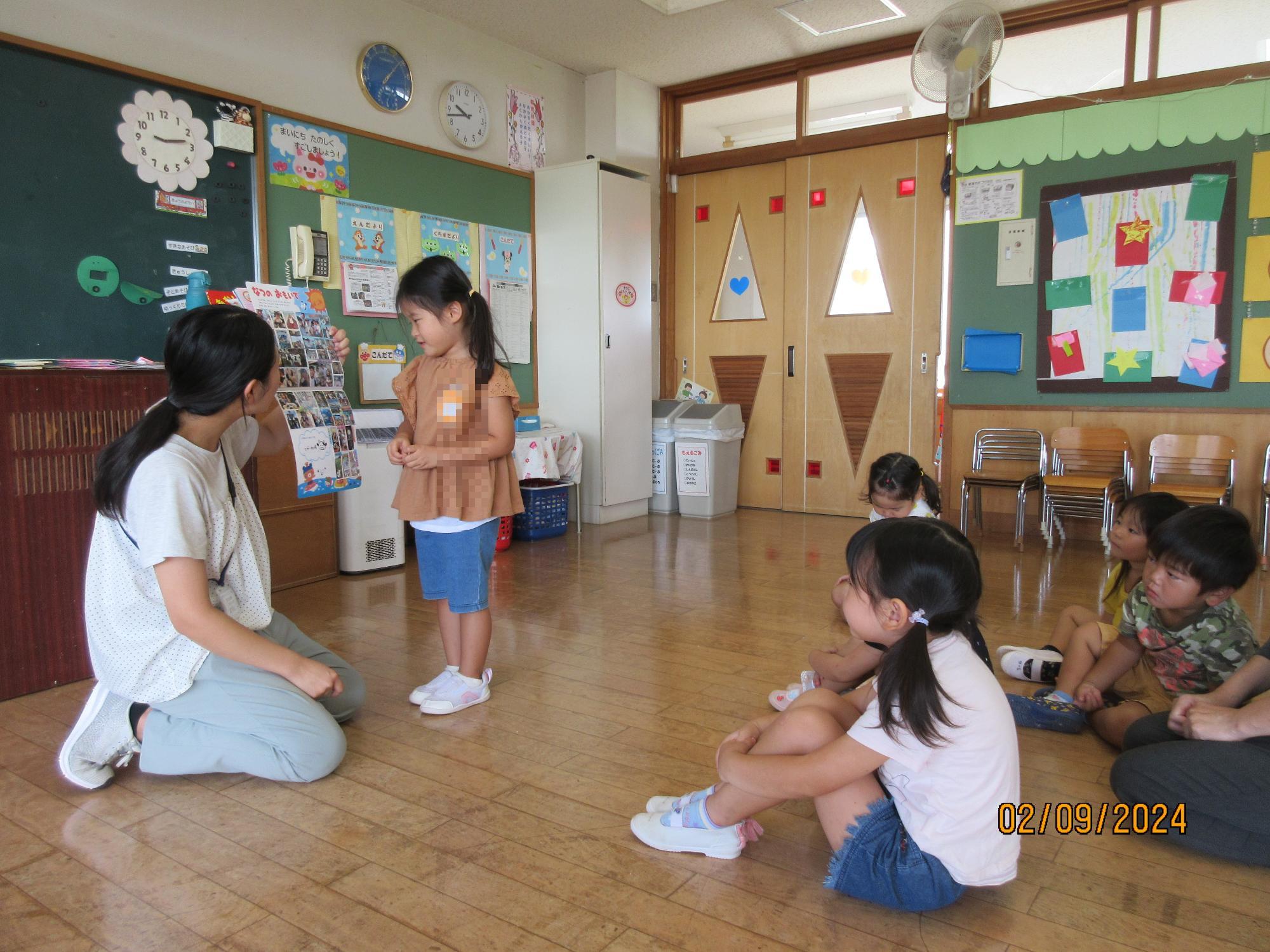 久しぶりの幼稚園、久しぶりの友達や先生に会えて、とてもうれしそうに過ごしています。夏休みの楽しかった思い出をみんなの前で発表しました。
