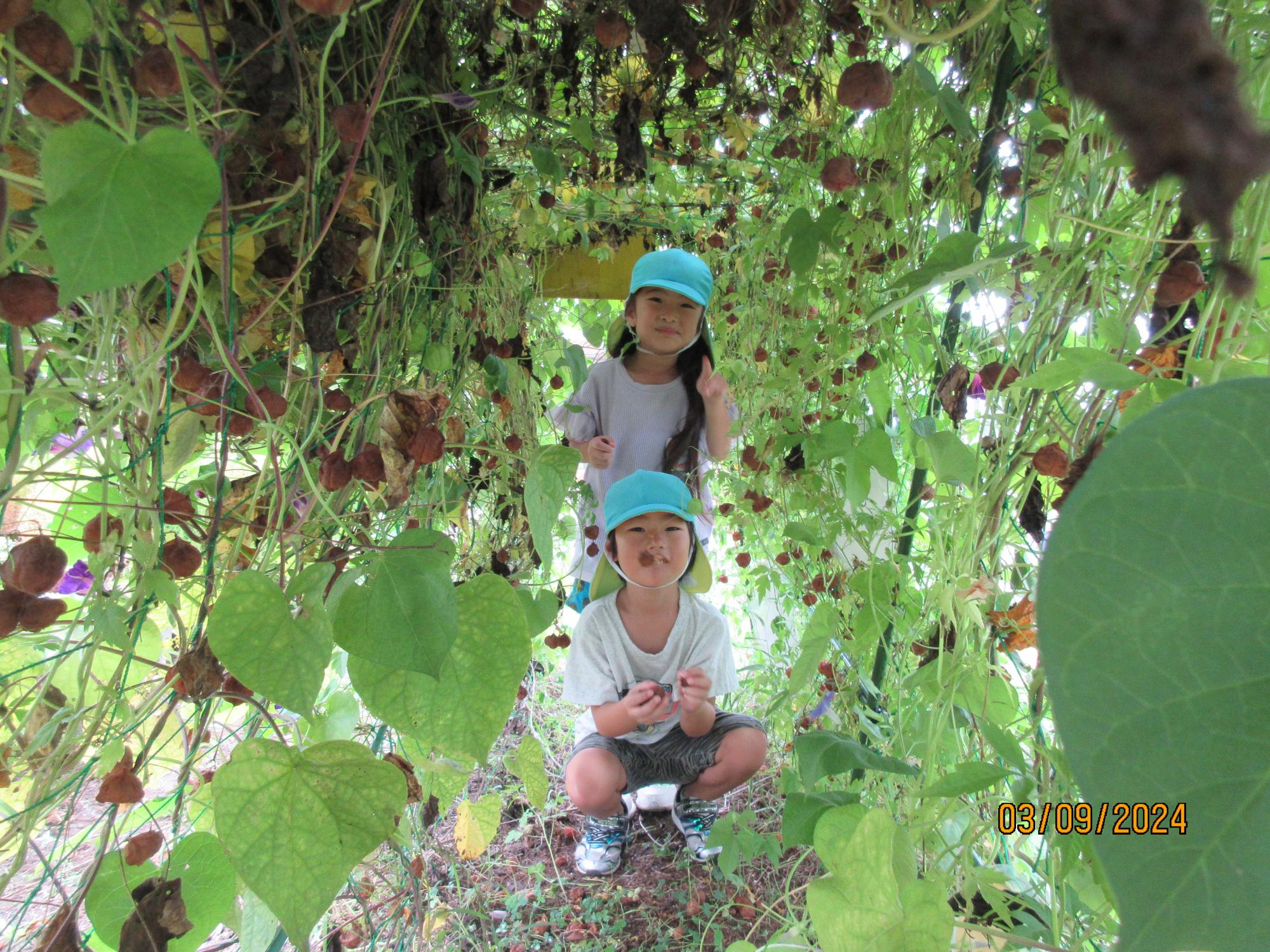 昨年の経験から、「フウセンカズラの種を取りにトンネルに入ろう!」と種取りを楽しんでいました。トンネルの中では、たくさんの種が見つかりましたね。