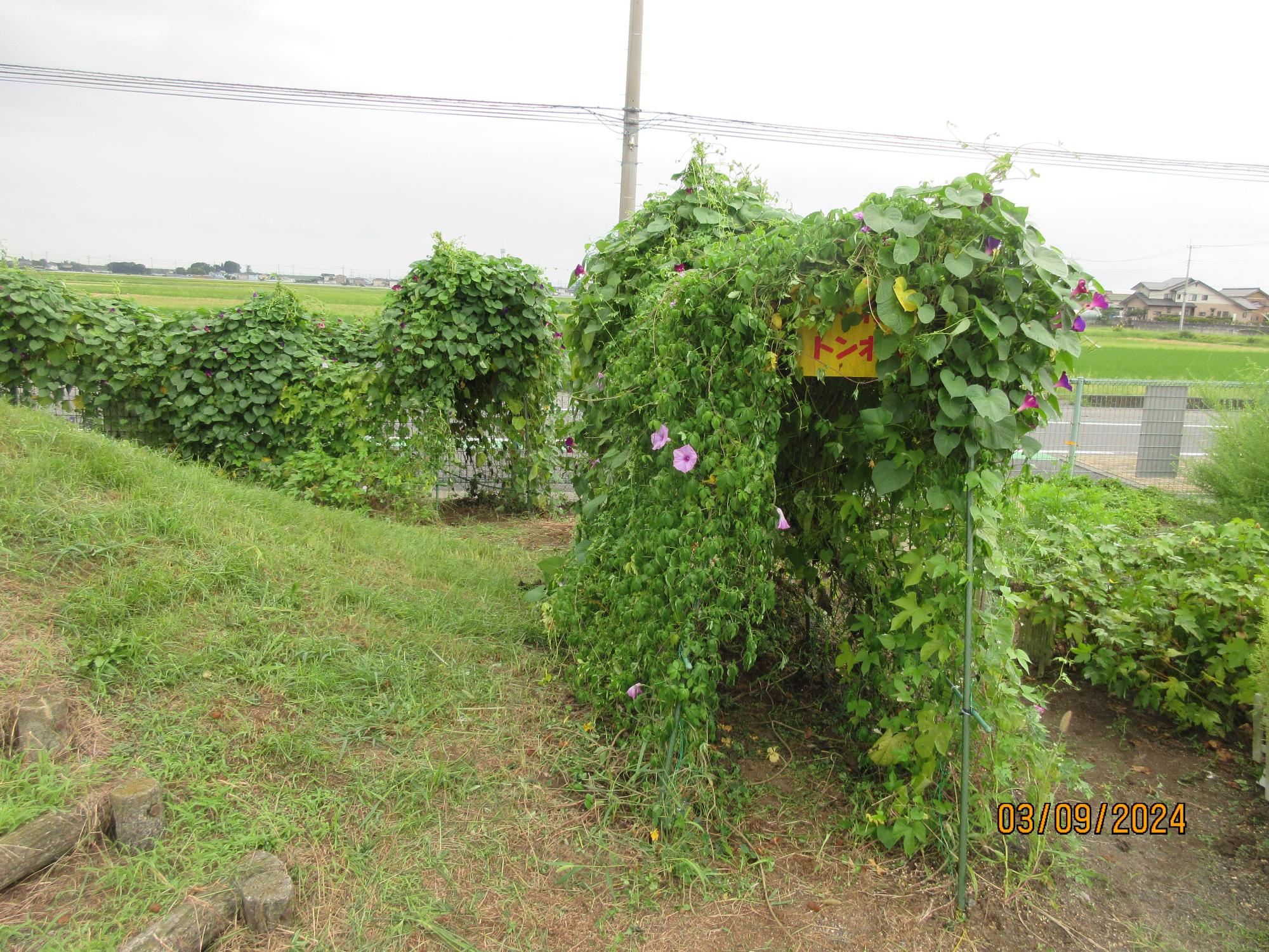 夏休み明け、看板が隠れてしまうくらい、アサガオやフウセンカズラが育っています。
