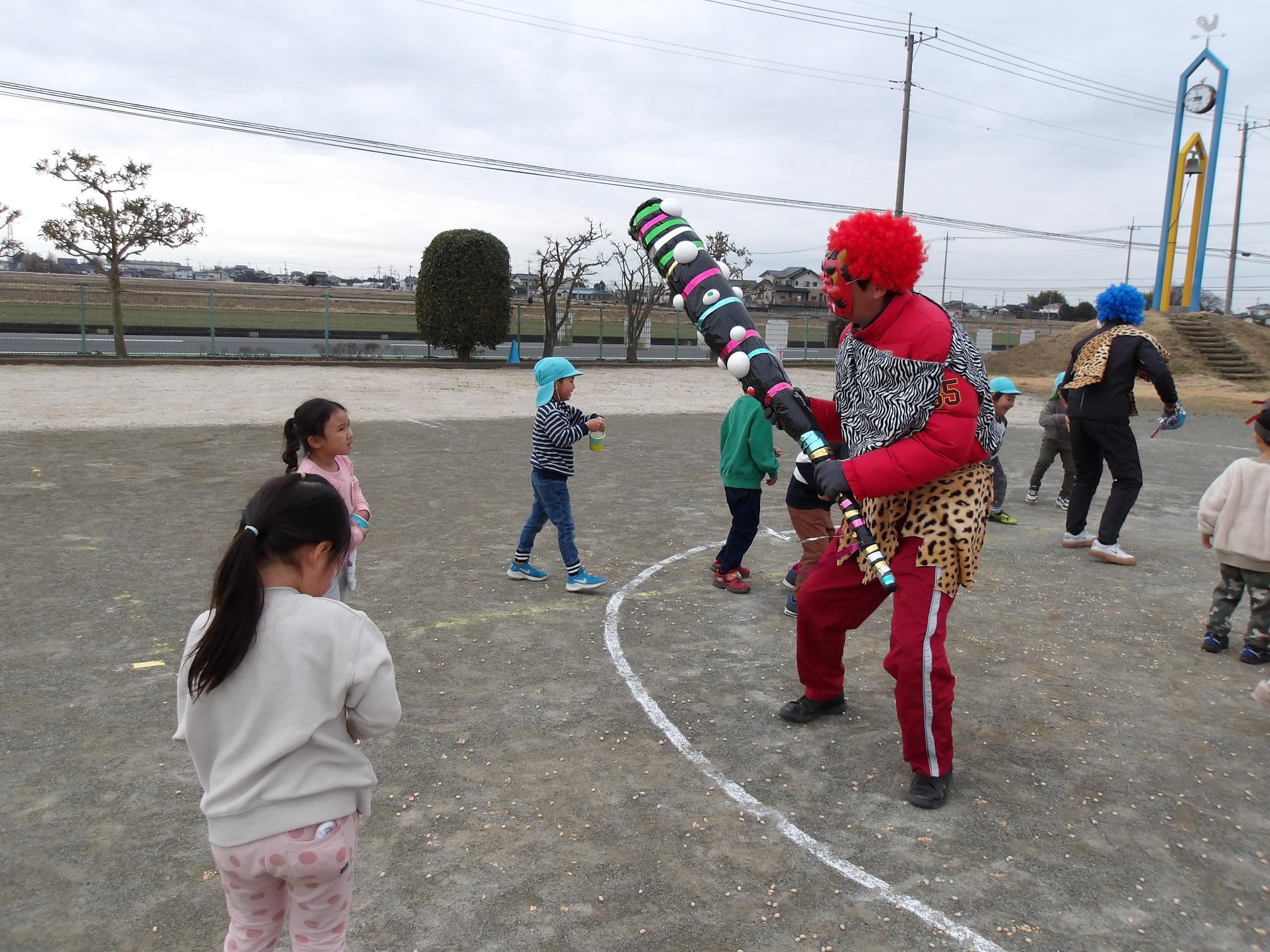 「おにはそと!」「ふくはうち!」と鬼役を交代しながら、皆で豆まきをしました。