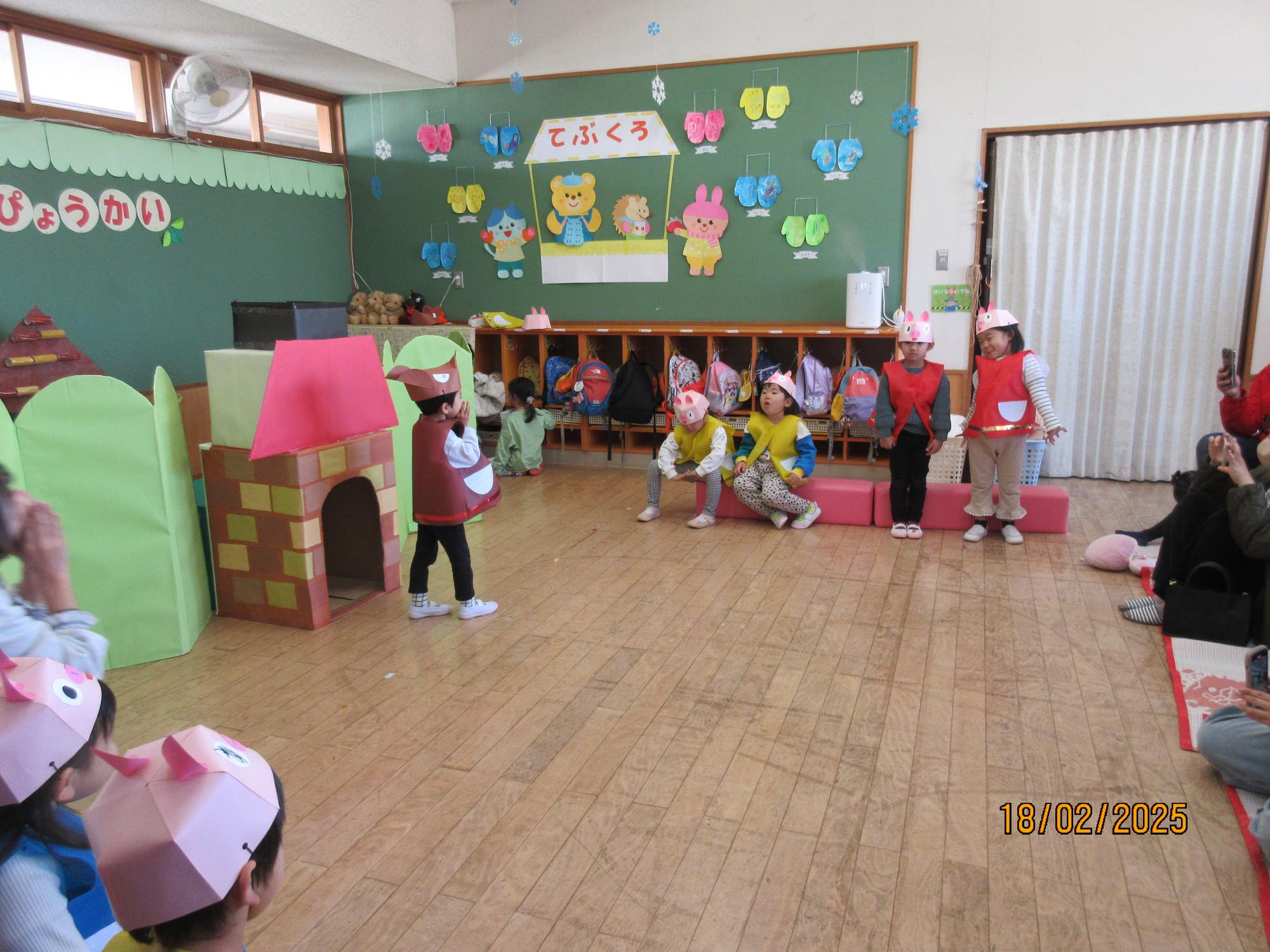 劇「3びきのこぶた」では、役になって演じることを楽しんで取り組む姿が見られました。