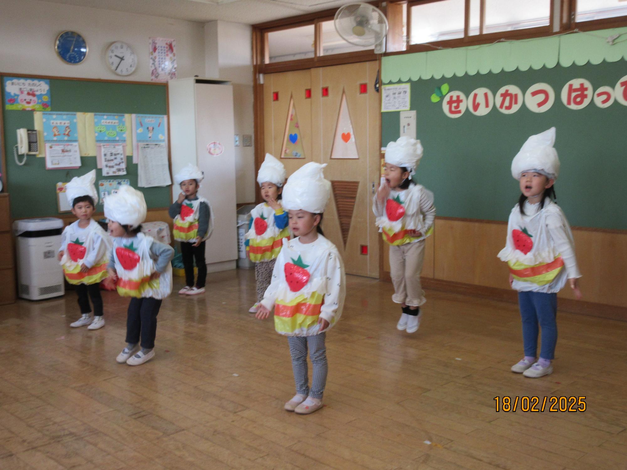 頭に生クリームの被り物をし、ショートケーキの衣装を着てダンスを踊りました。かわいかったですね。