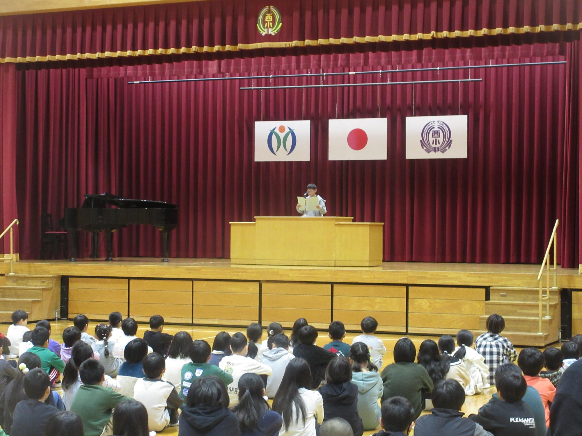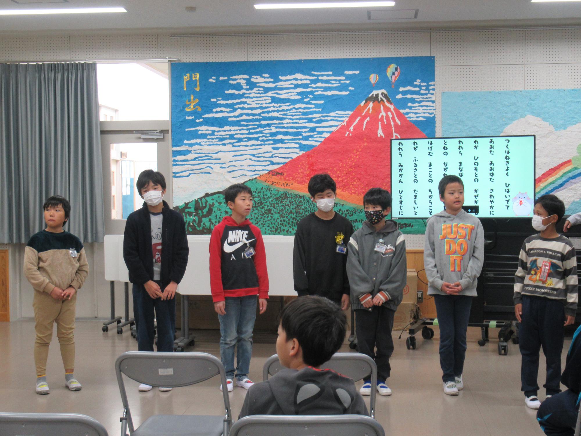 また、4年生の代表児童が作文発表をしました。漢字のテストや体育の授業などを通して、「諦めないで挑戦するとよい結果が得られる」ことを学びました。