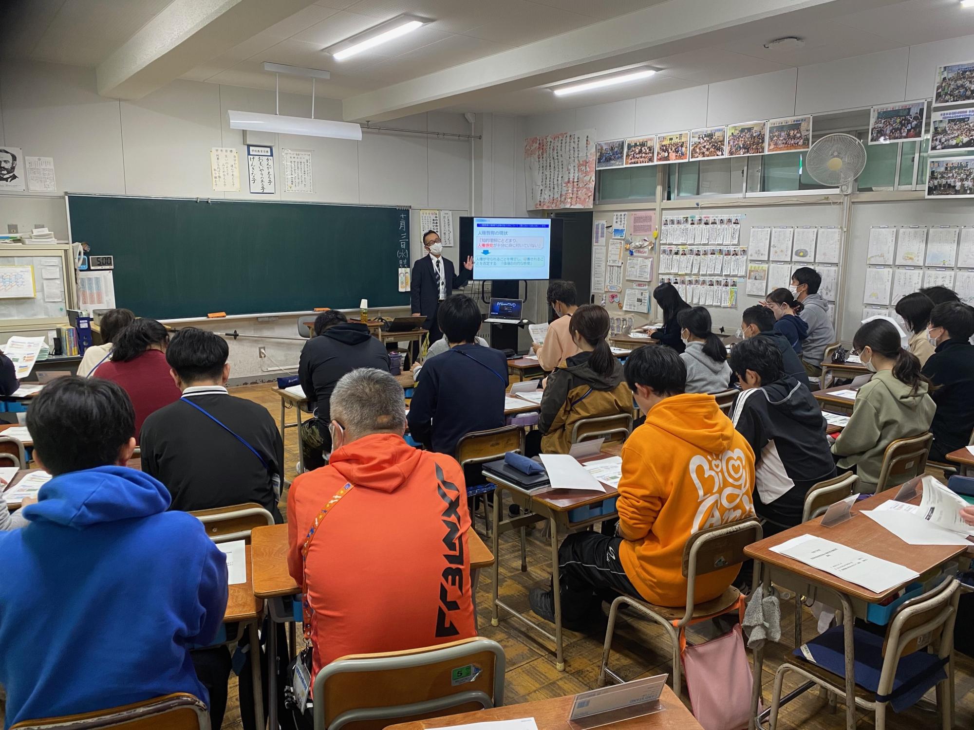 市教育委員会の先生をお招きして、本校教員を対象に人権教育に係る講義を基にした研修を行いました。人権感覚を磨くための視点や大切さを学んだり、個別課題に対する知的理解を深めたりする内容でした。教育活動に生かしていきます。