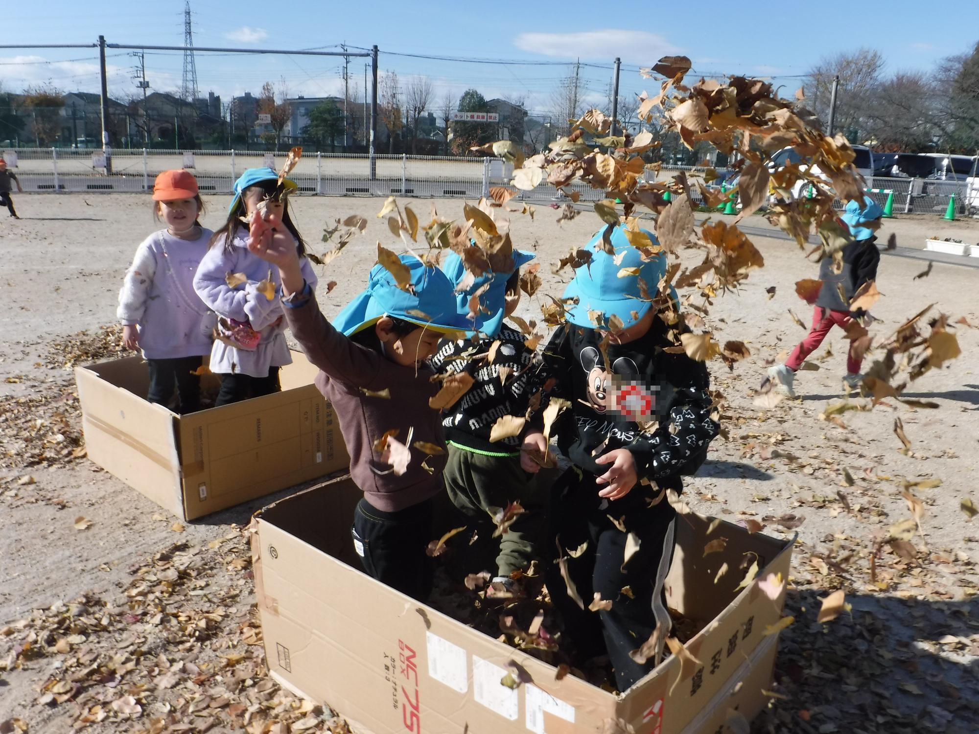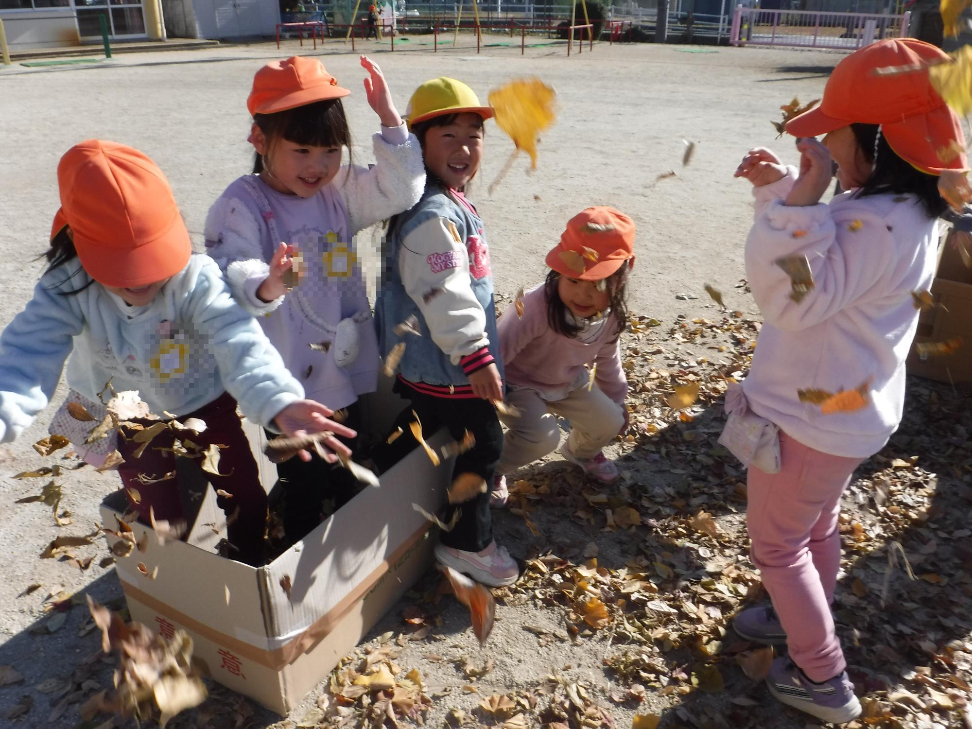 わくわくぼうけんのもりから飛んできた落ち葉を使って、落ち葉遊びをしました。