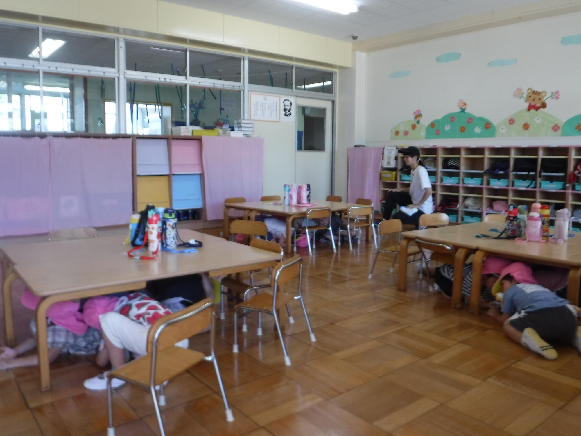 「地震が発生しました。」のアナウンスを聞いて、すぐに机の下にもぐり身を守ることができました。