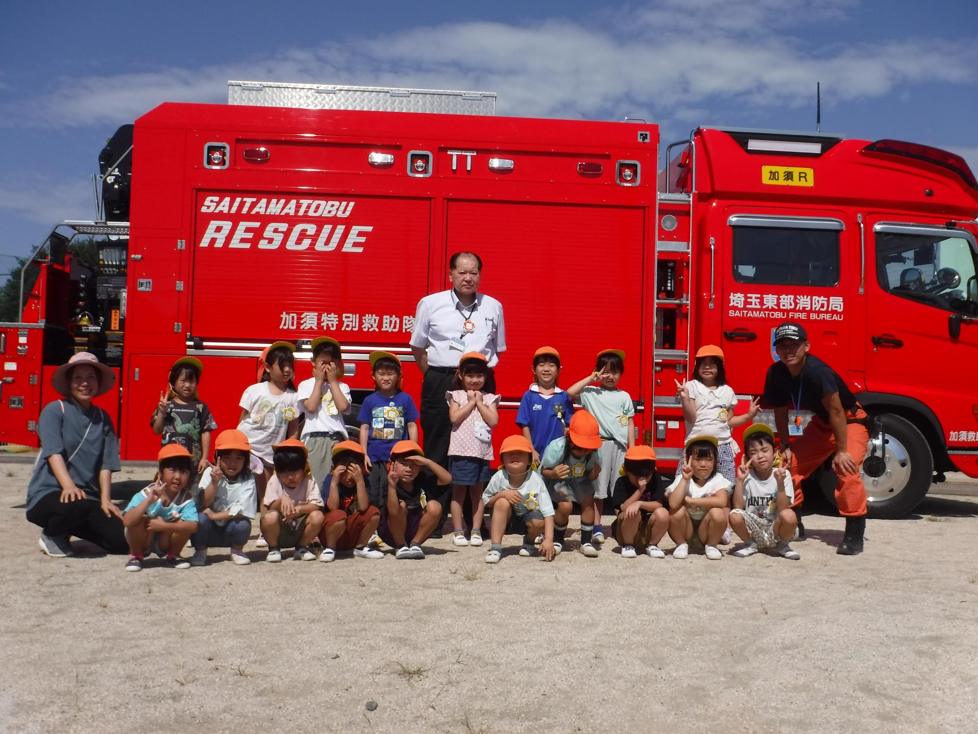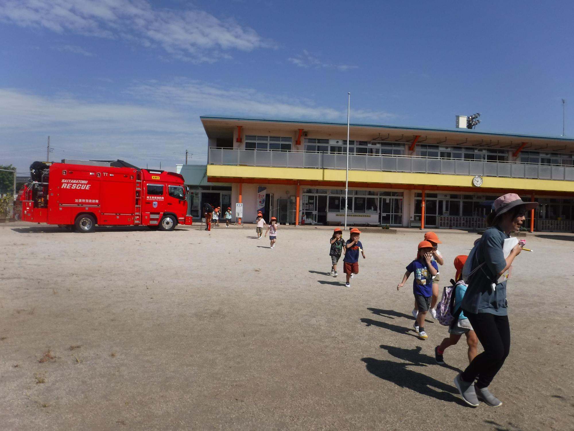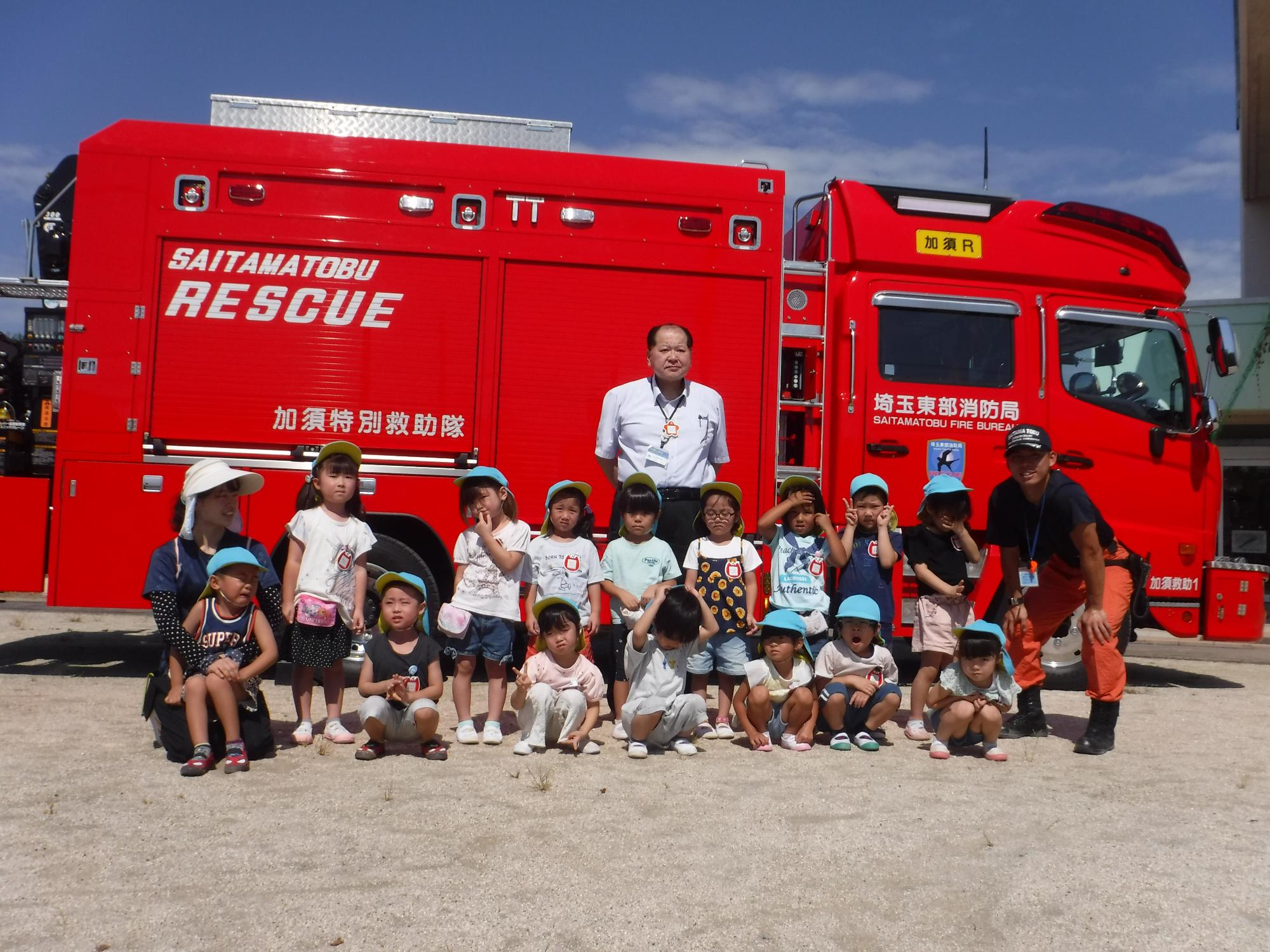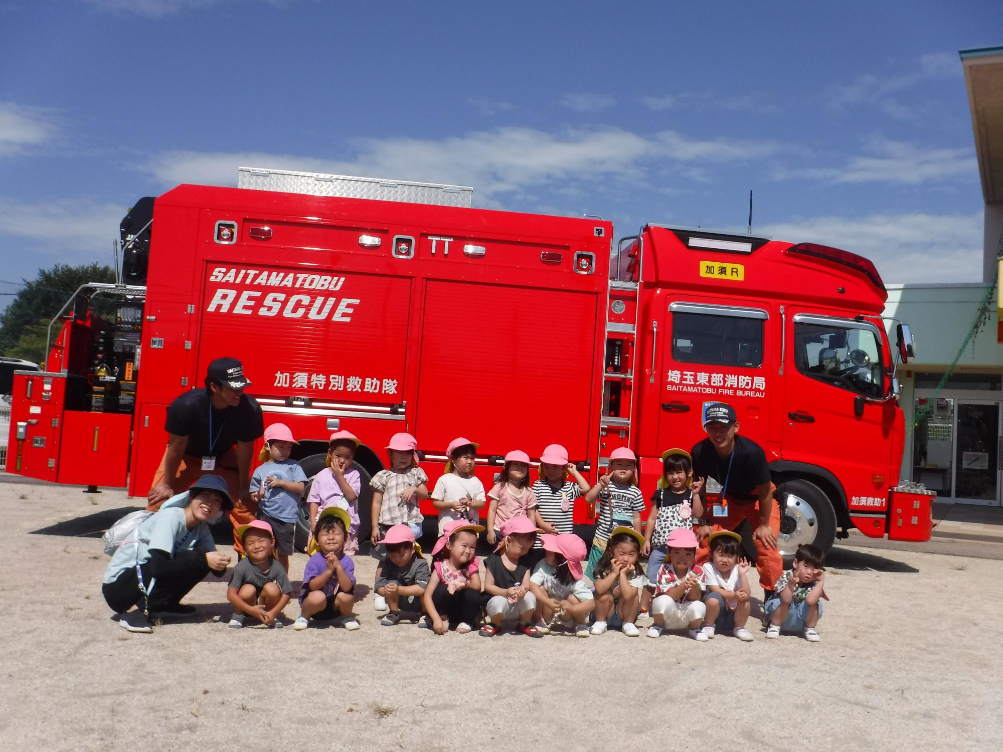 大きな消防自動車に大興奮のりす組さん。