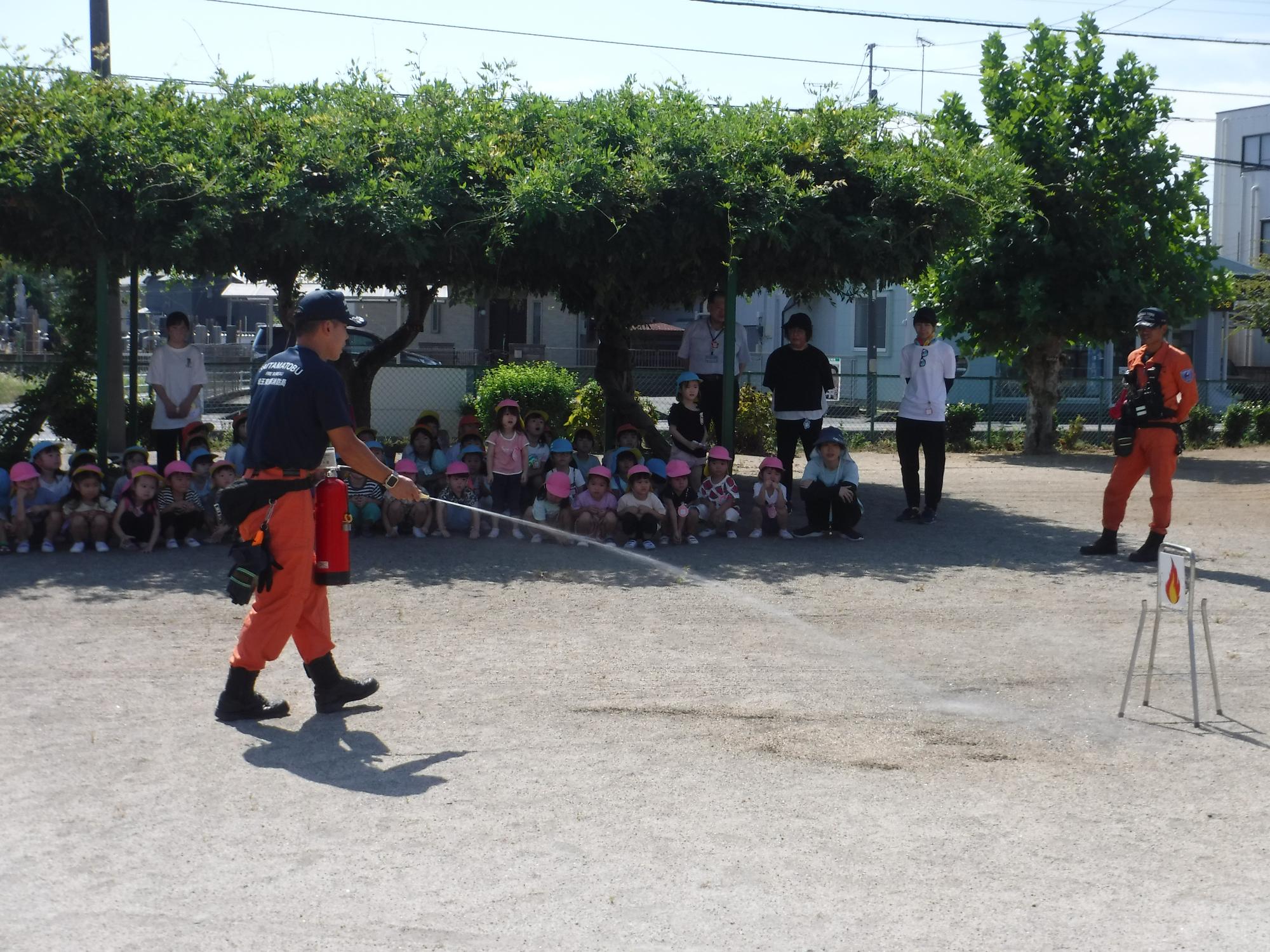 消火器の使い方を教えていただきました。その後、先生方が実際に訓練しました。