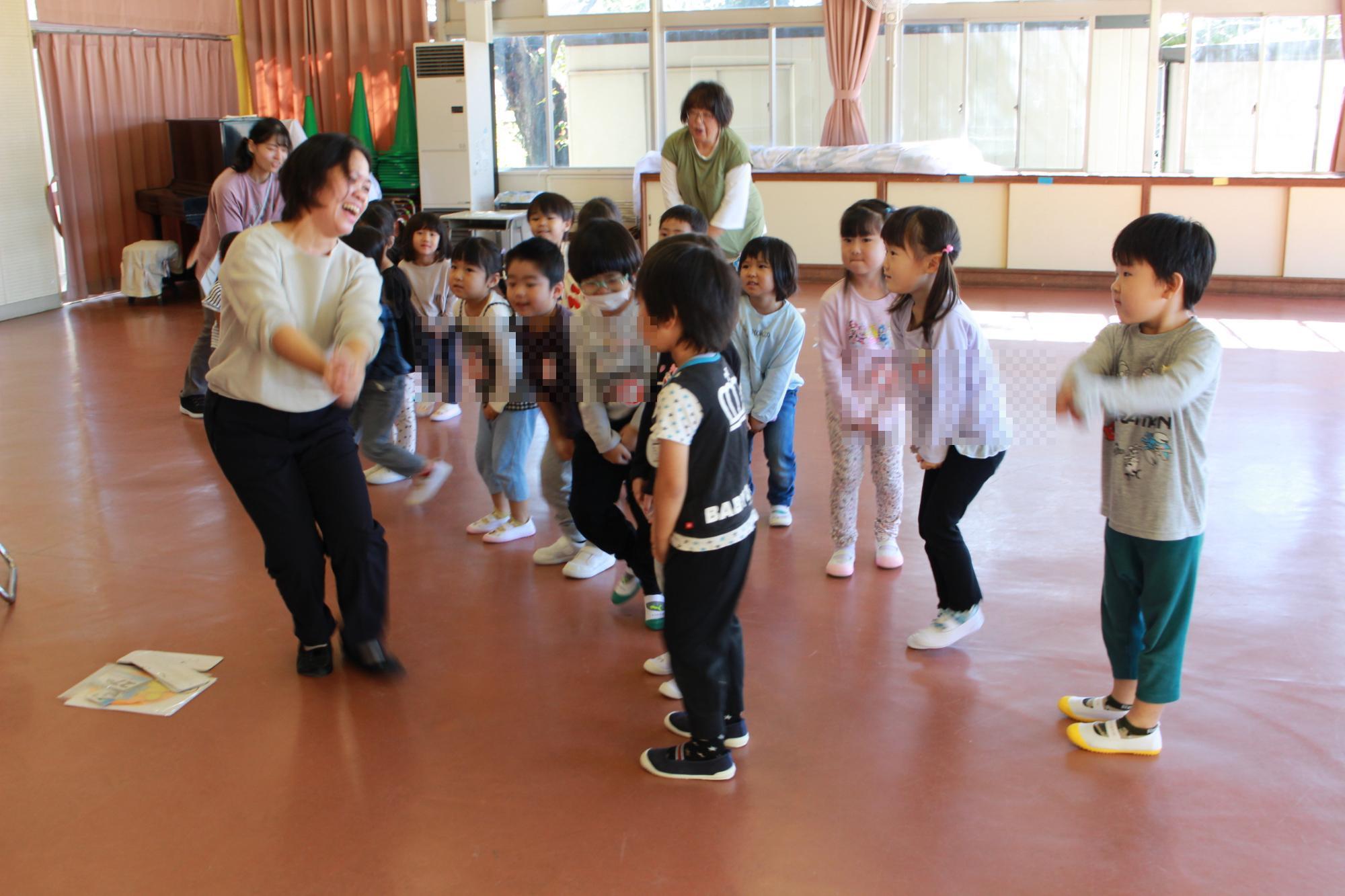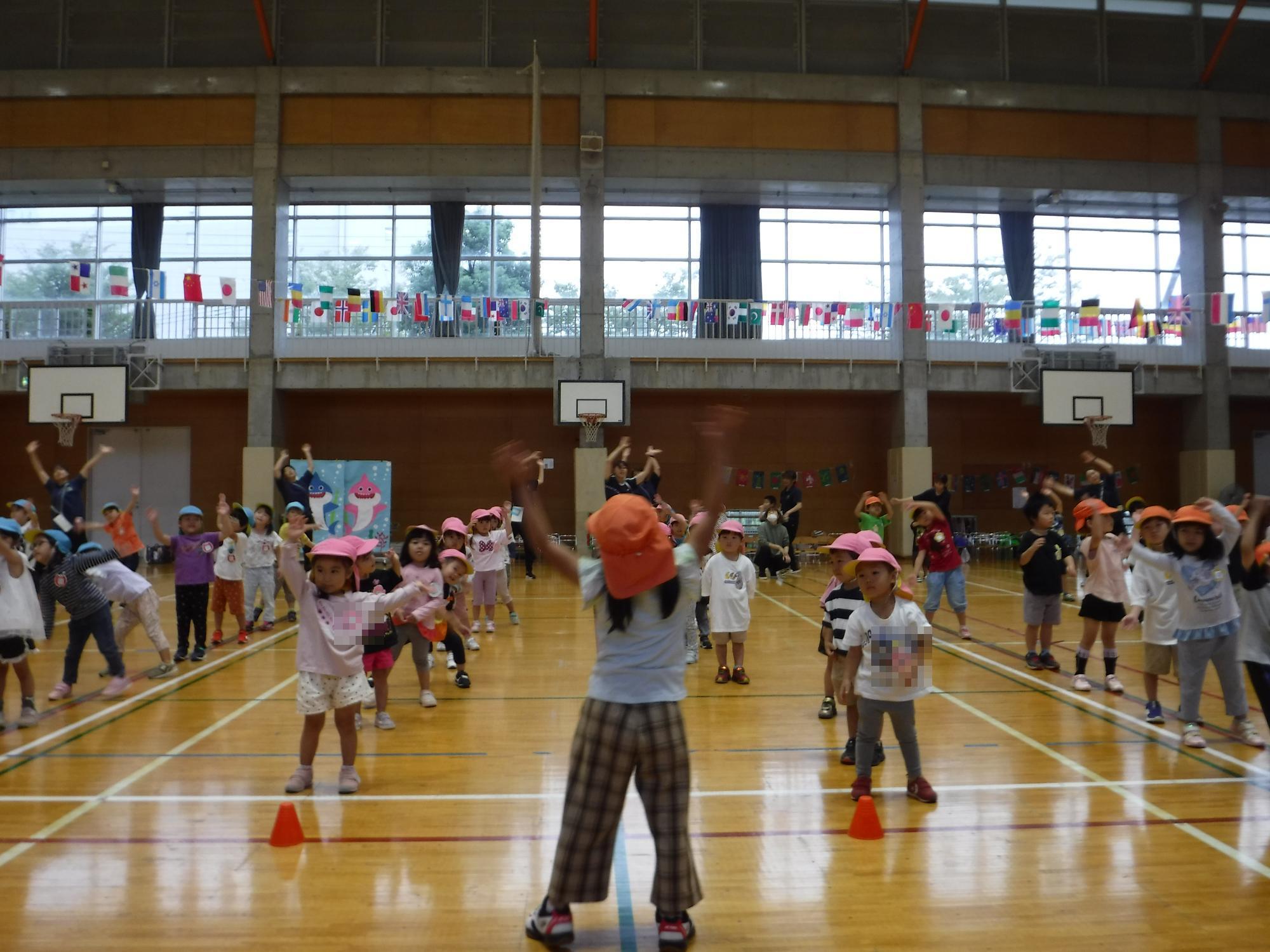 体操教室では、準備運動やストレッチをして体を動かしてから活動を楽しみました。