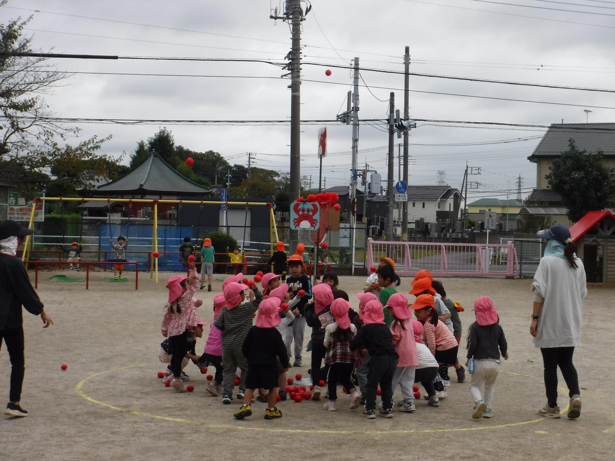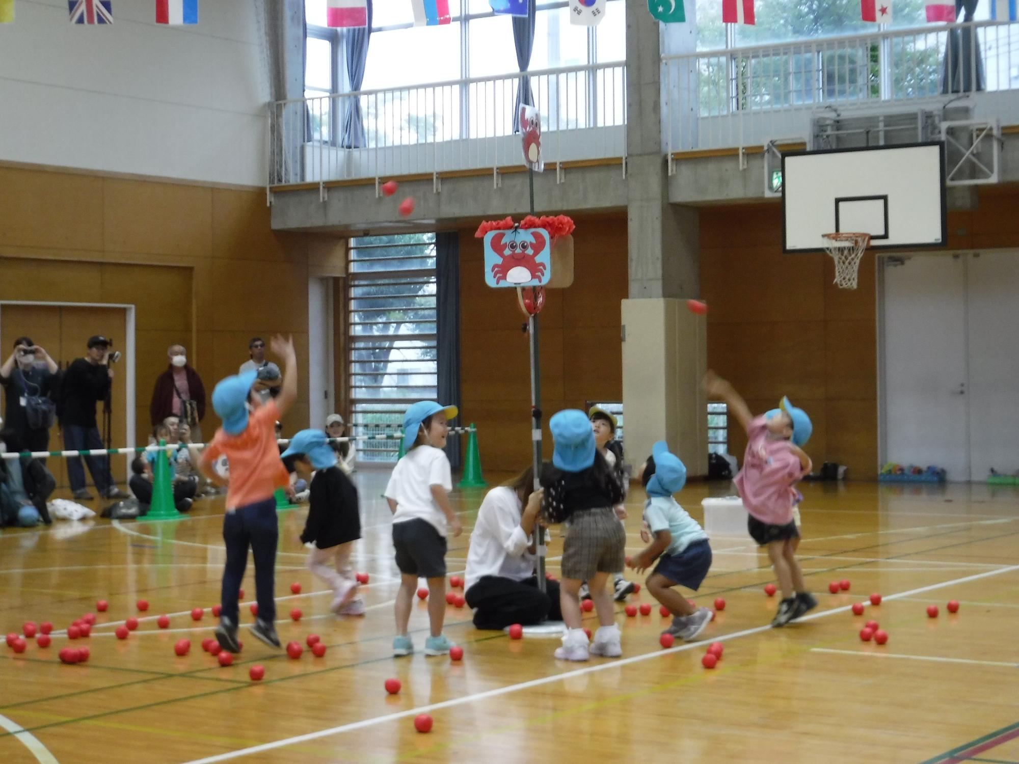 年中いちご組で行った、玉入れをりす組さんも楽しみました。みんなで投げたら、たくさん入りましたね。
