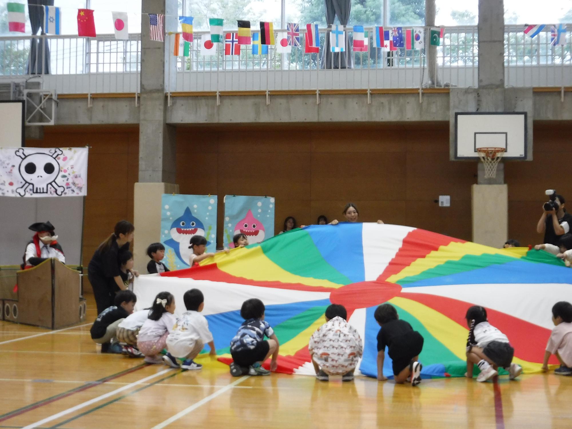 雨天のため、今年度は小学校の体育館で運動会を行いました。今年は「うみ」がテーマの運動会です。