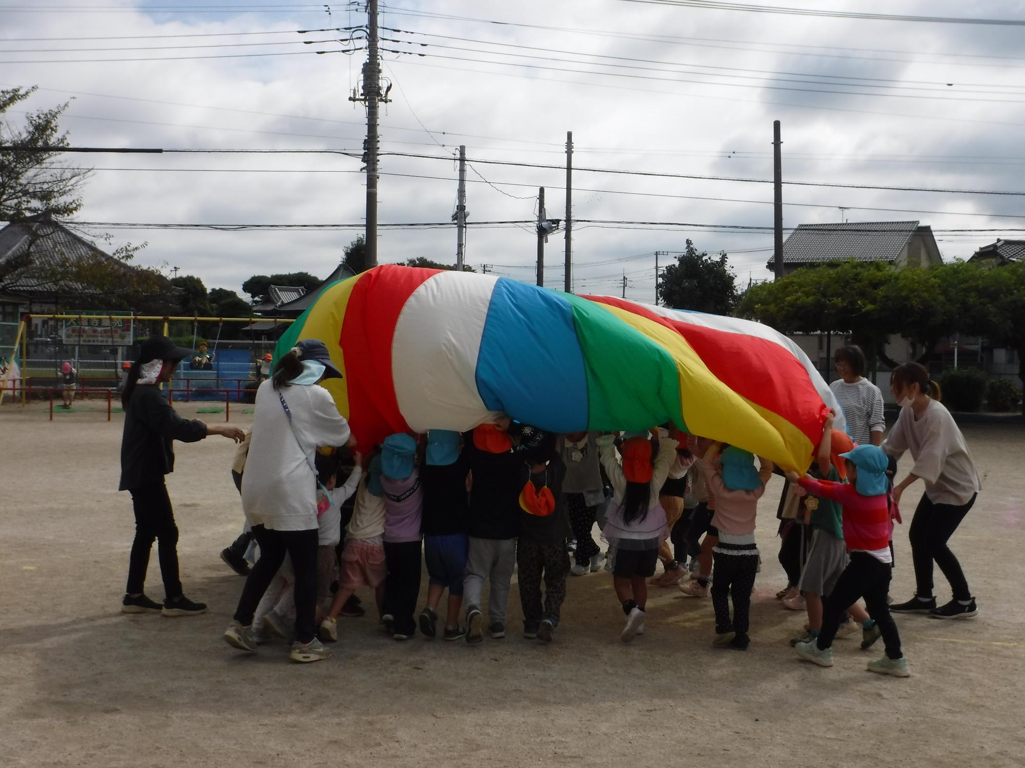 みんなで、バルーンに挑戦!大きく膨らんだり、花火に見立てたキラキラボールをあげたときには、大きな歓声が上がりました。