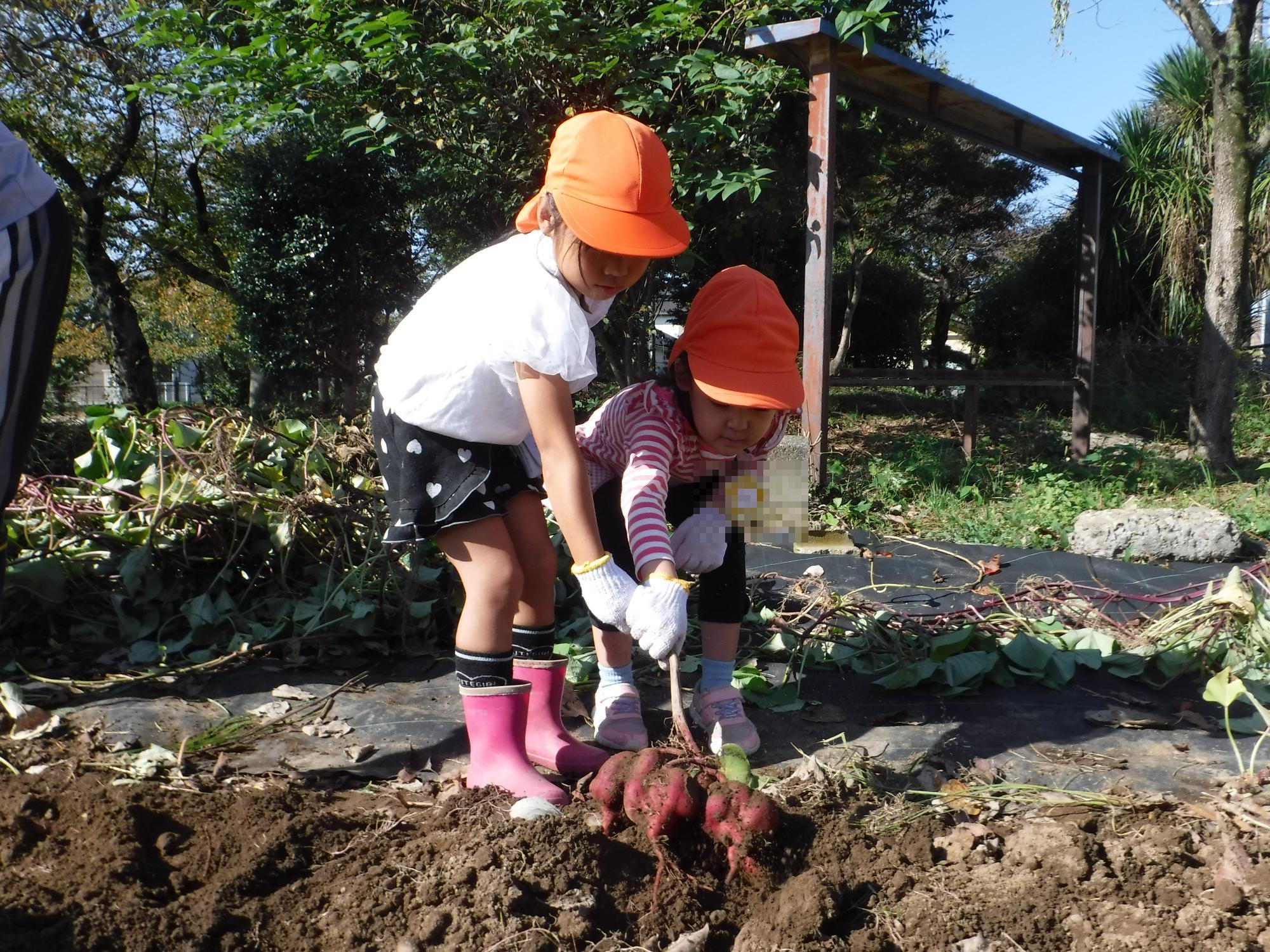 「うんとこしょ!」こんなに大きなサツマイモが出てきました。