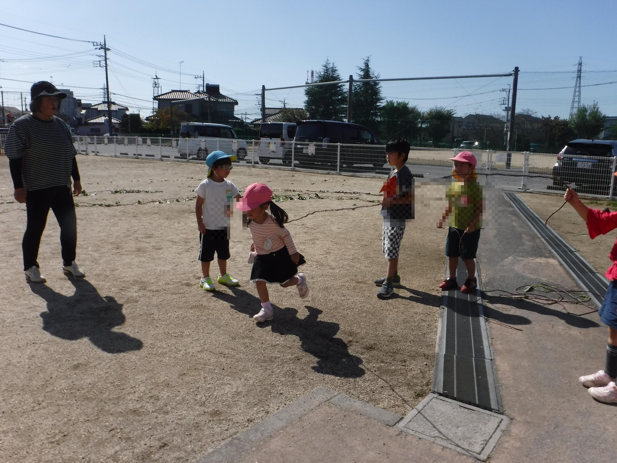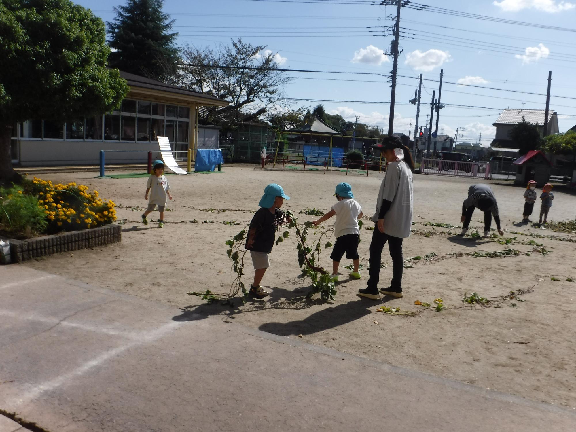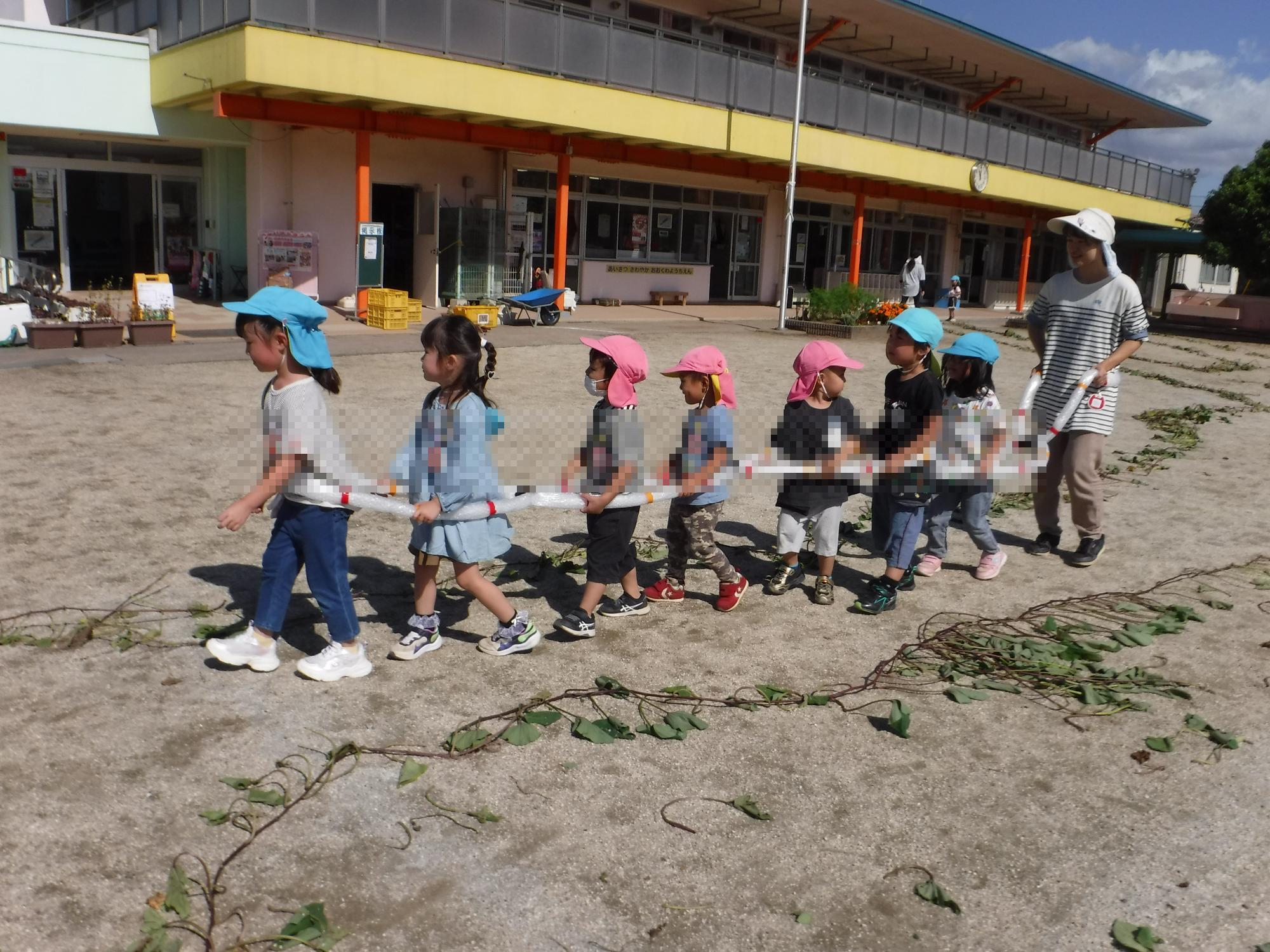みんなで、電車ごっこも楽しかったですね。サツマイモを掘ったり、つるで遊んだり、いろいろな遊び方をして楽しみました。