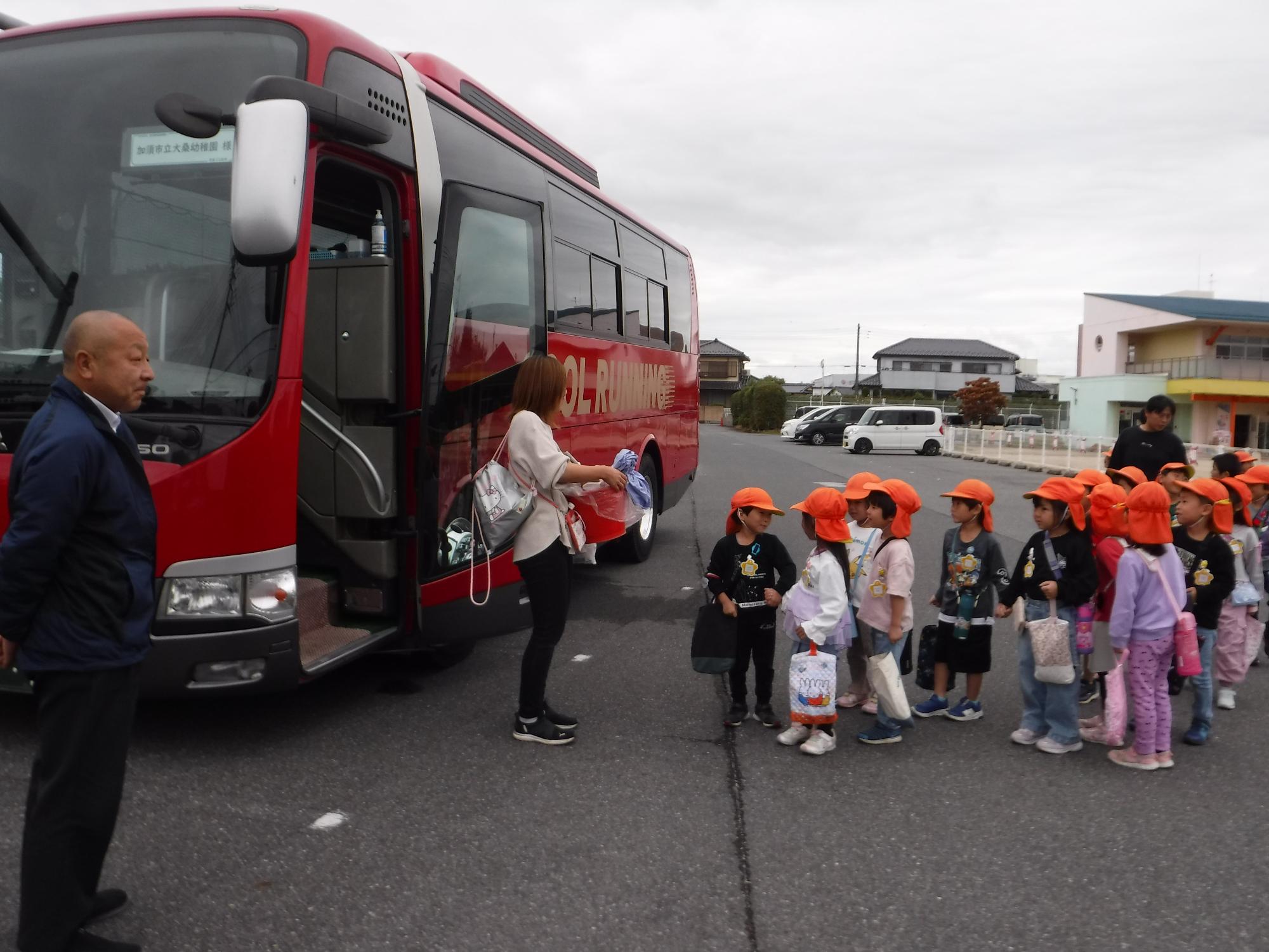 赤いバスに乗って、こすもす保育園へ出発です。