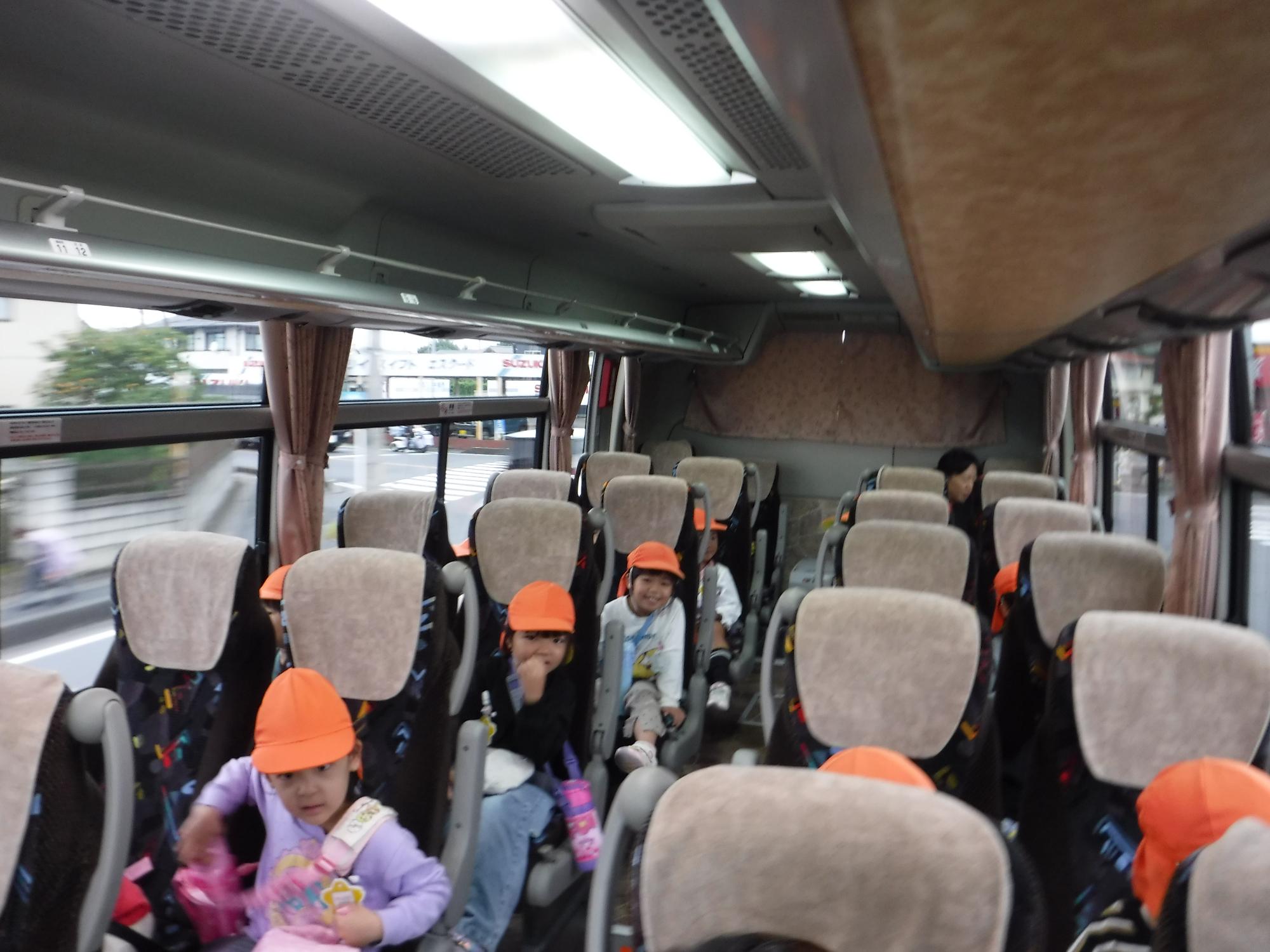 バスに乗って大興奮のこども達。窓から見える景色を見て「ここ行ったことある!」など、友達の会話を楽しんでいました。