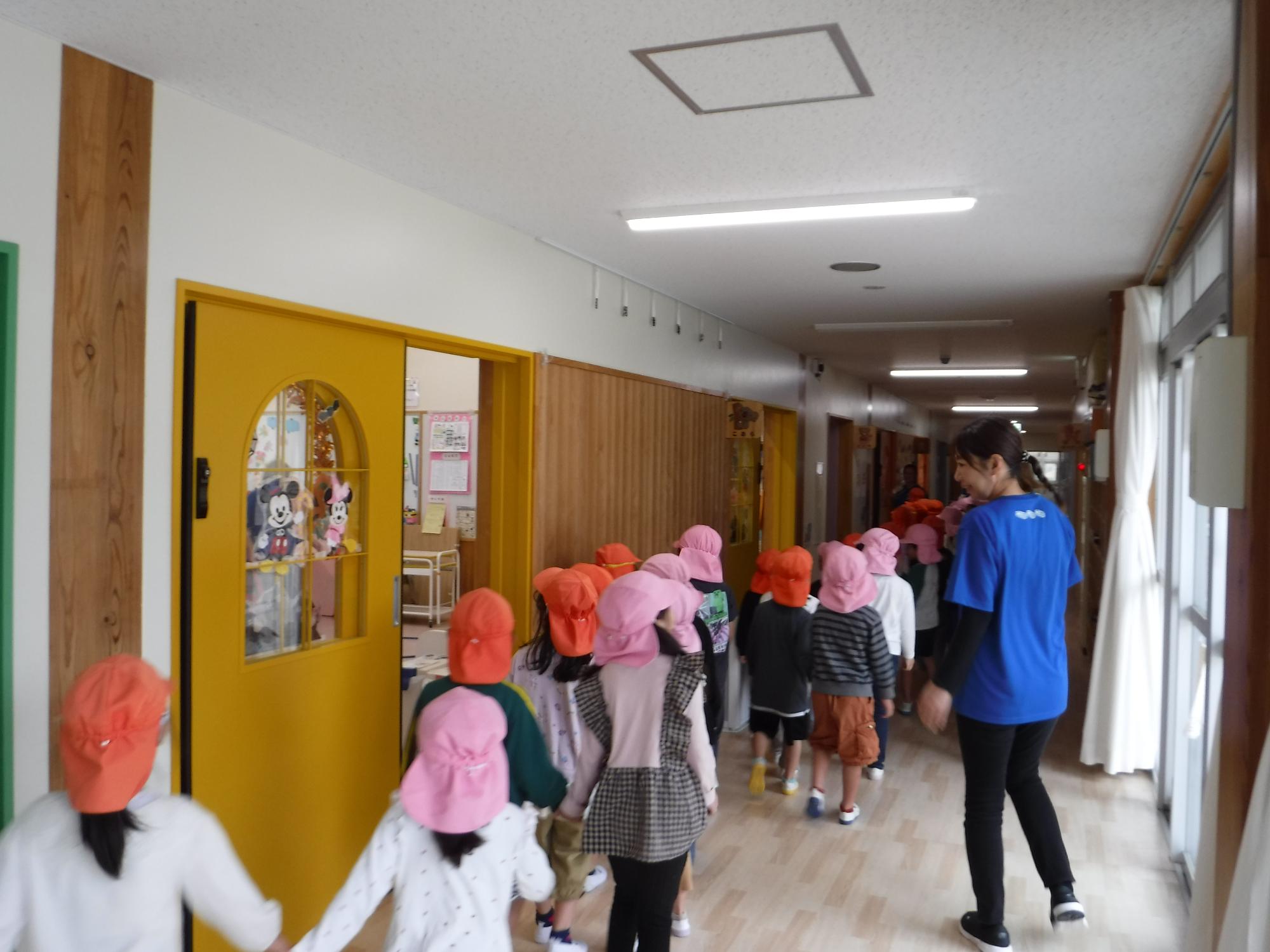 引き渡しの避難訓練を行いました。「おかしもち」の約束をしっかり守って避難することができました。 あいにくの雨でしたが、訓練をしておくことで、いざという時の行動がとれます。ご協力ありがとうございます。