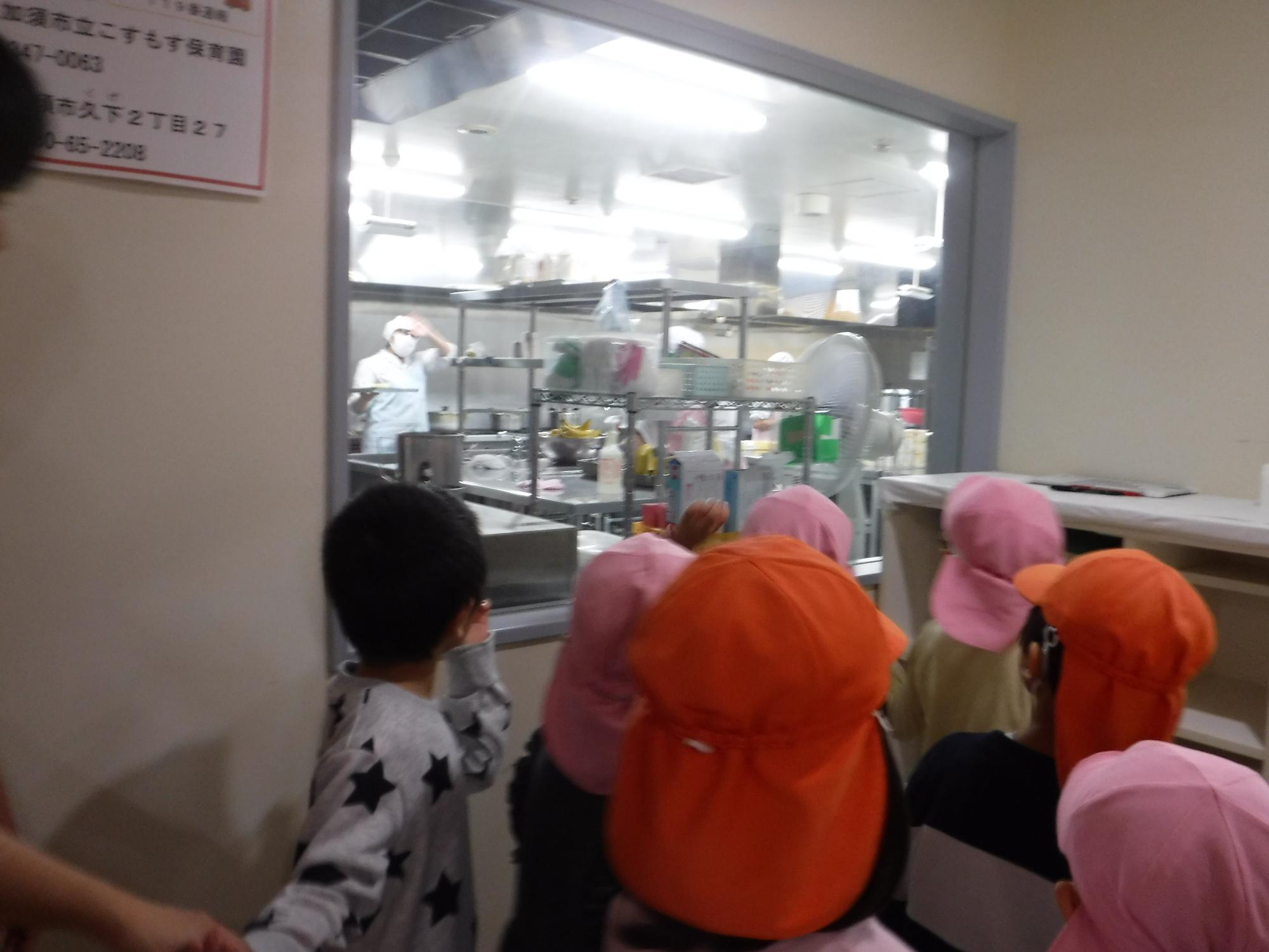 保育園は、園内で給食を作っています。調理している様子に興味津々です。