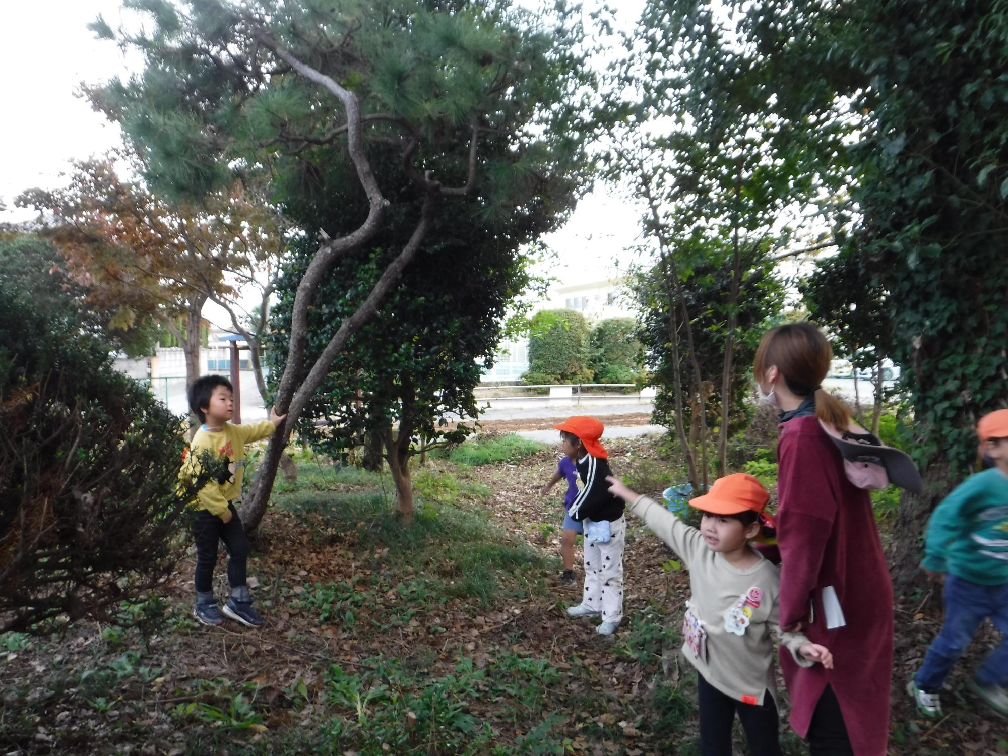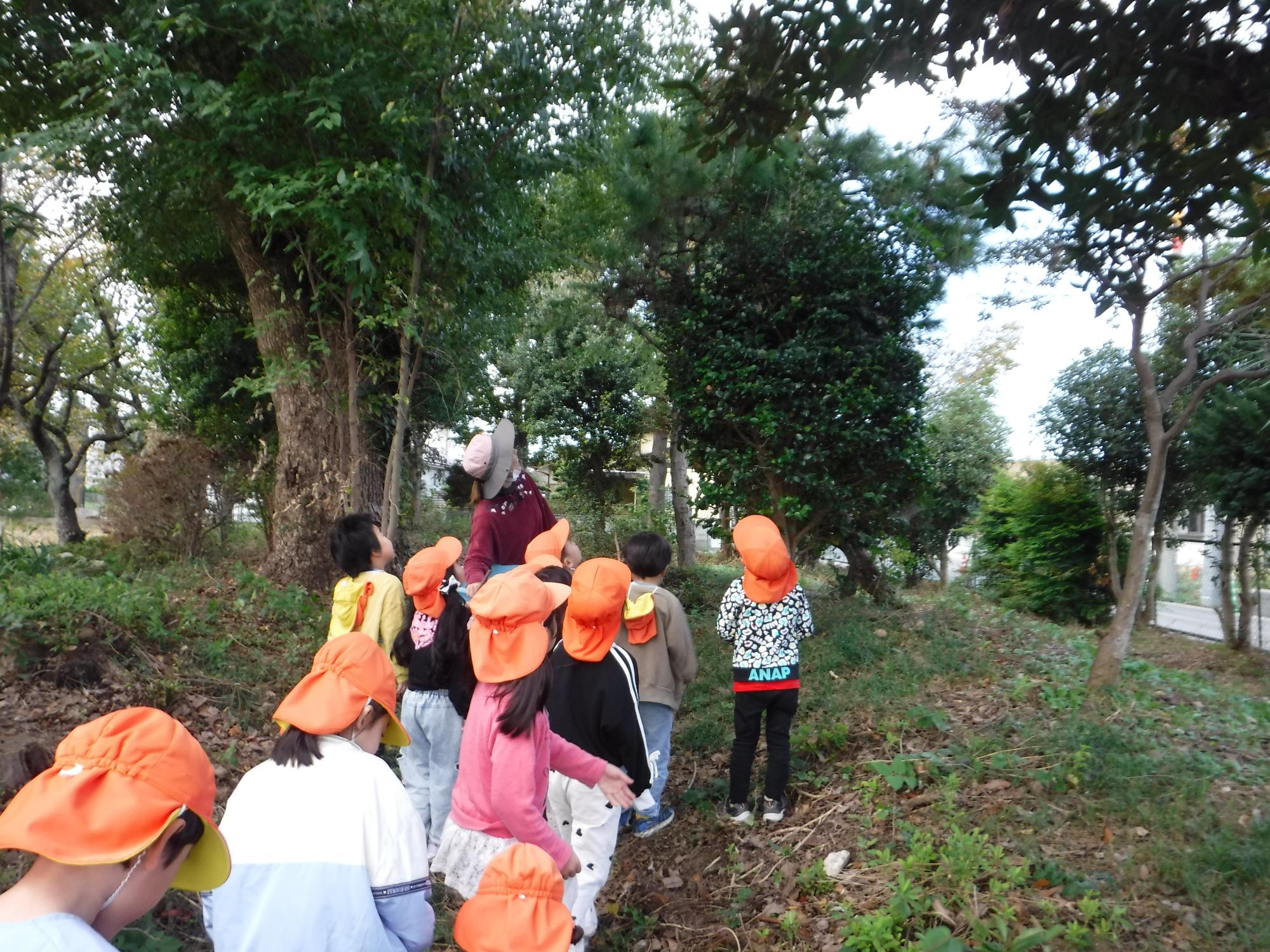 「松ぼっくりがある!」上を見上げると、いろいろな発見がありました。