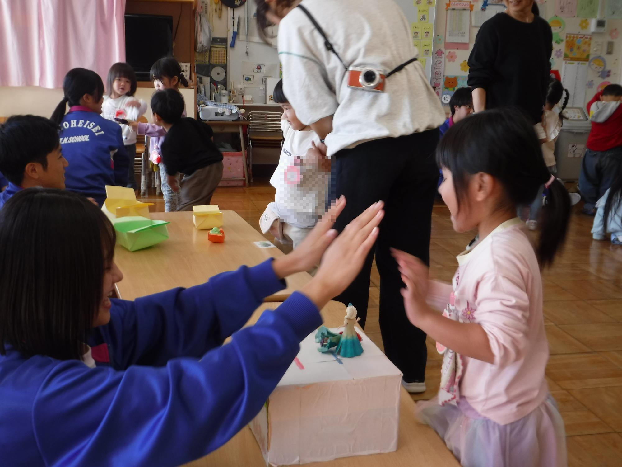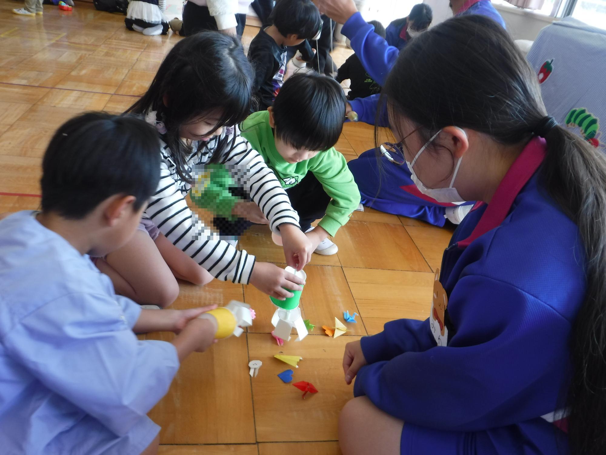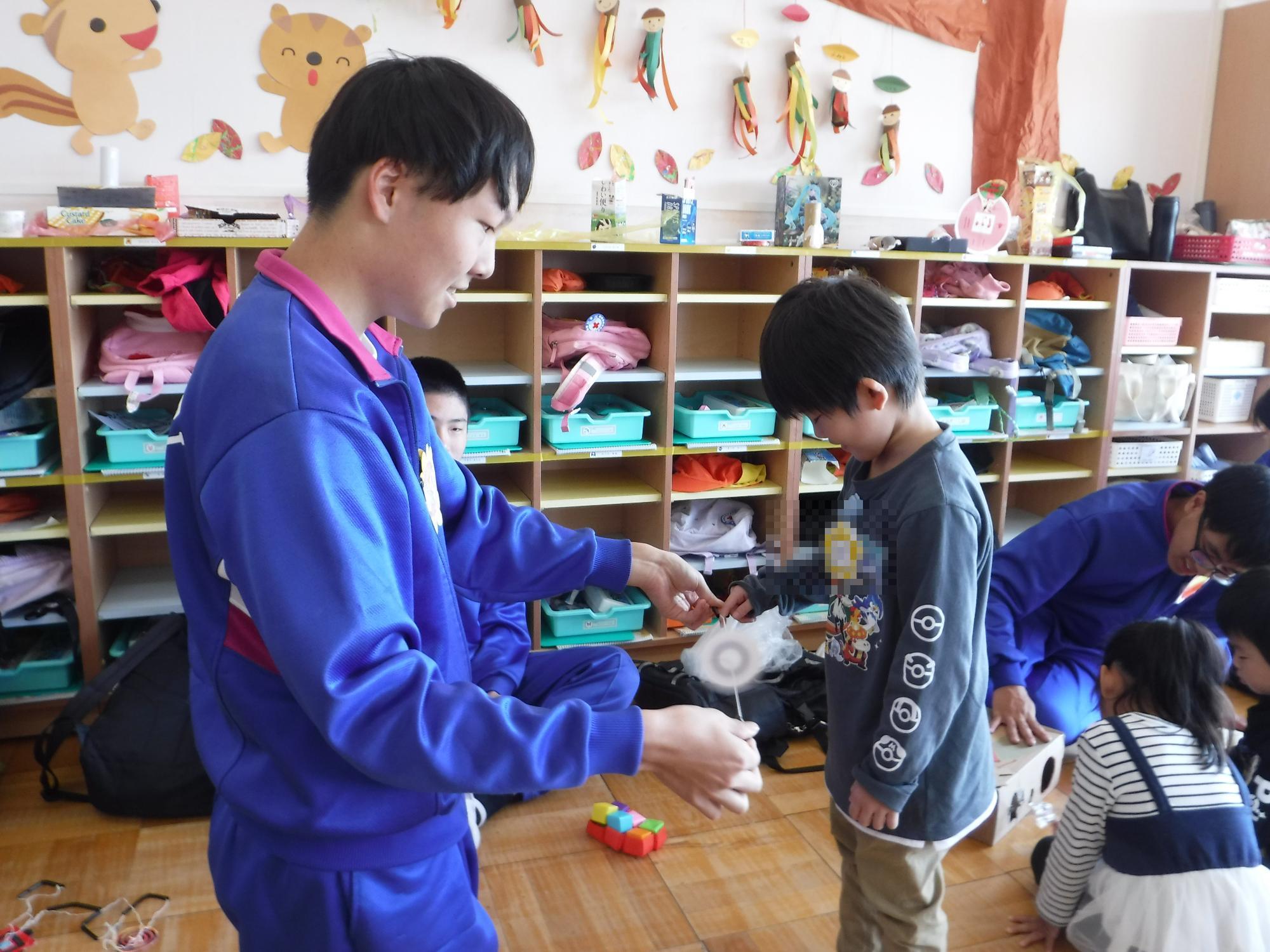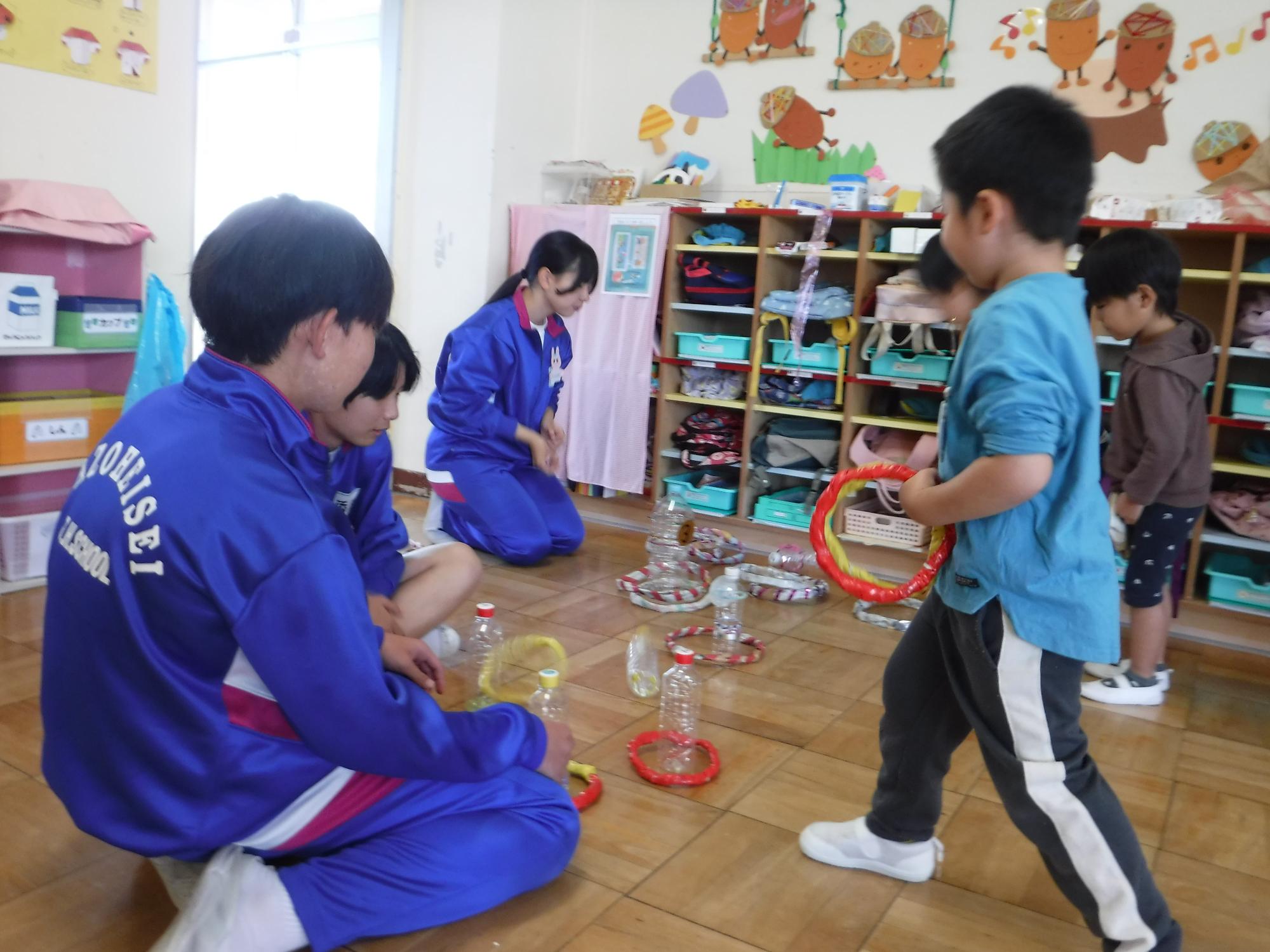 自分たちが作ったおもちゃのコーナーで、遊び方を丁寧に教えてくれながら一緒に遊び、ふれあいを楽しみました。