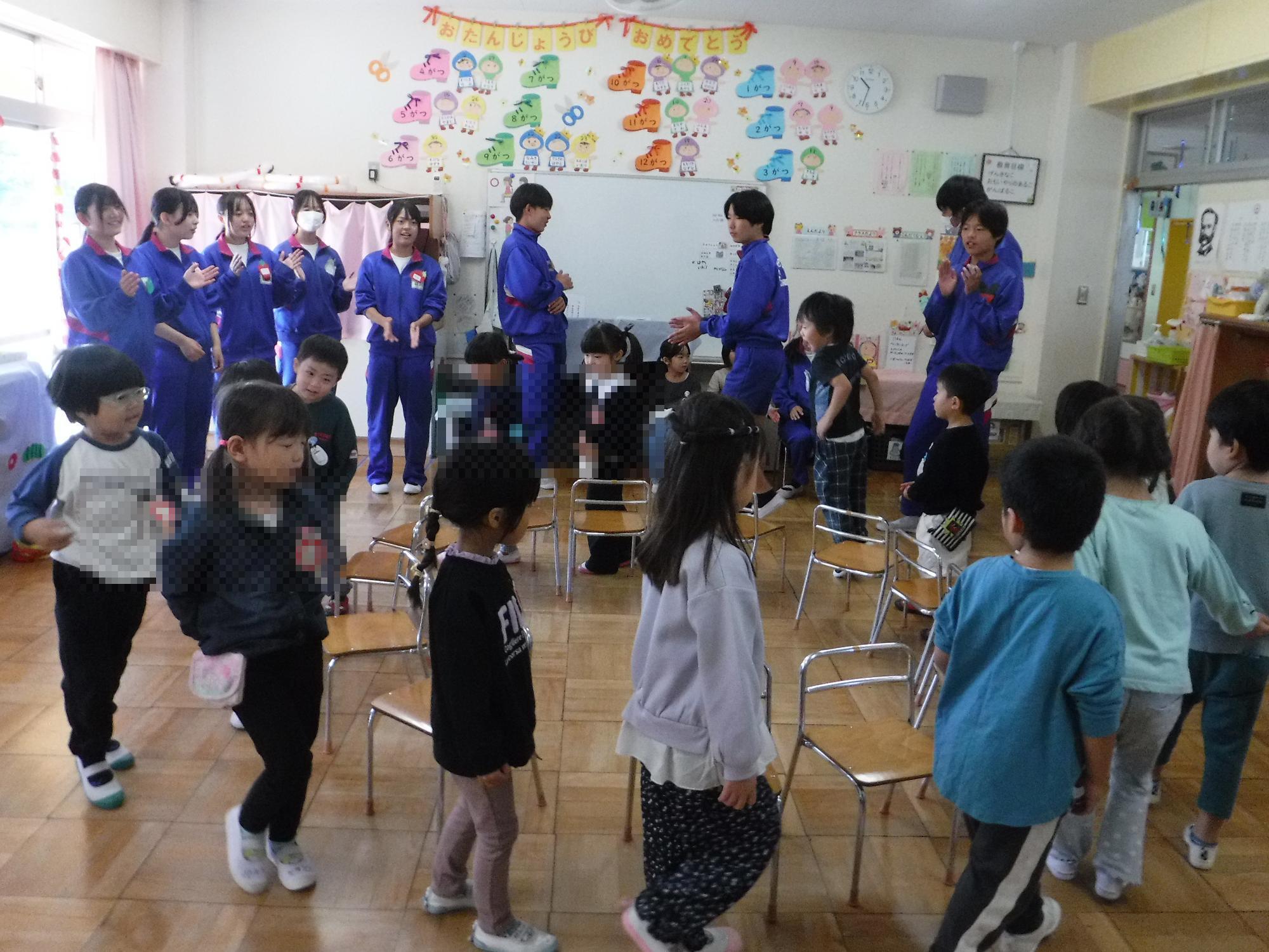 中学生の歌声とともに、椅子取りゲームを楽しみました。(いちご組)