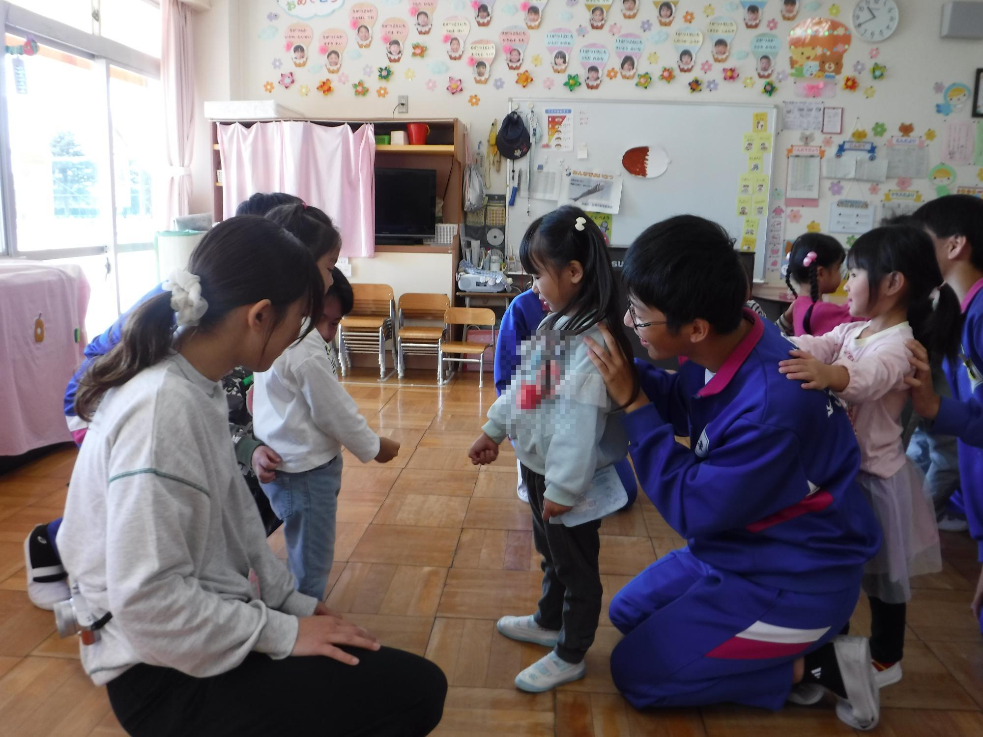 保育園の子とペアになり、互いに自己紹介をしています。