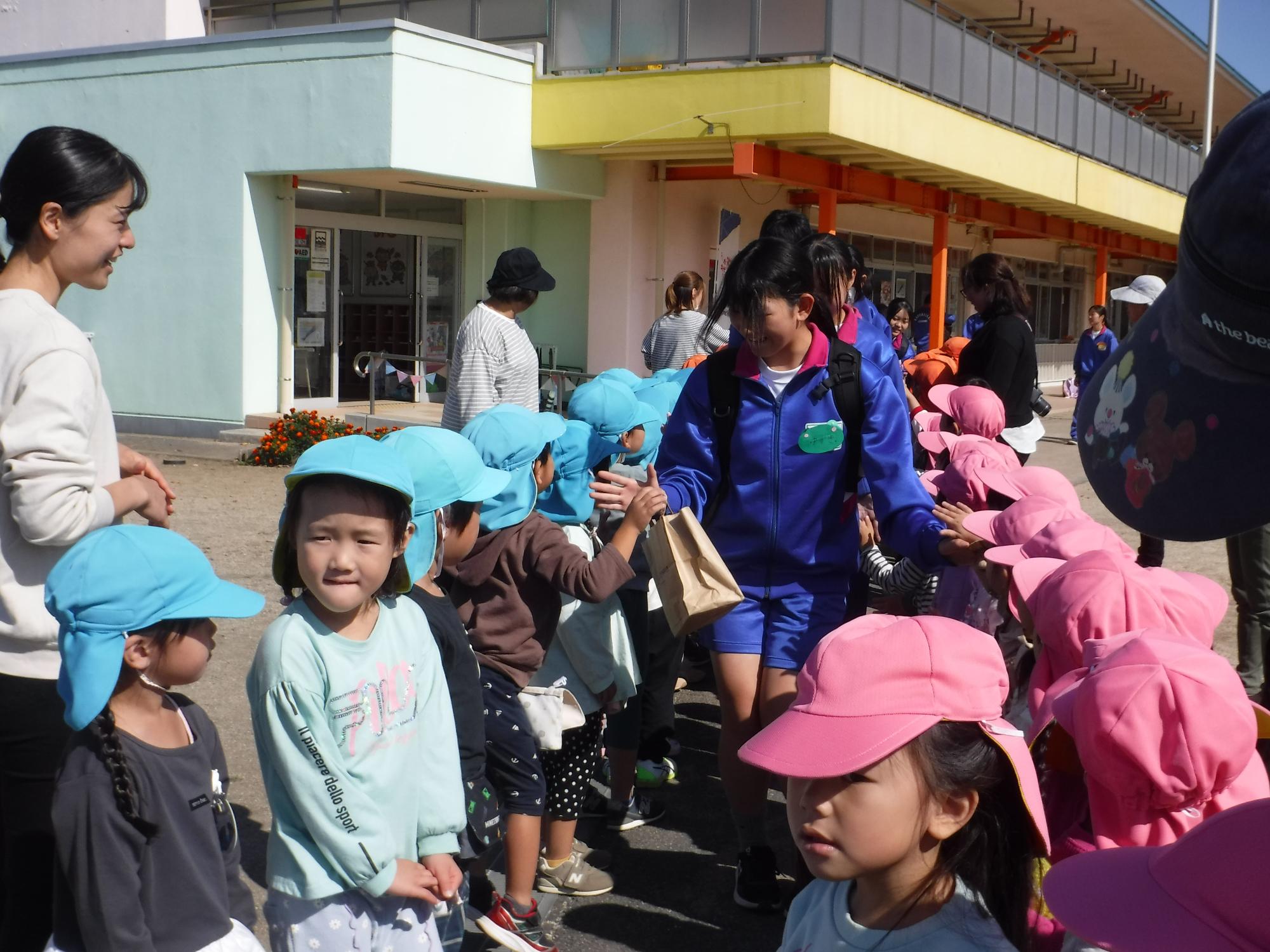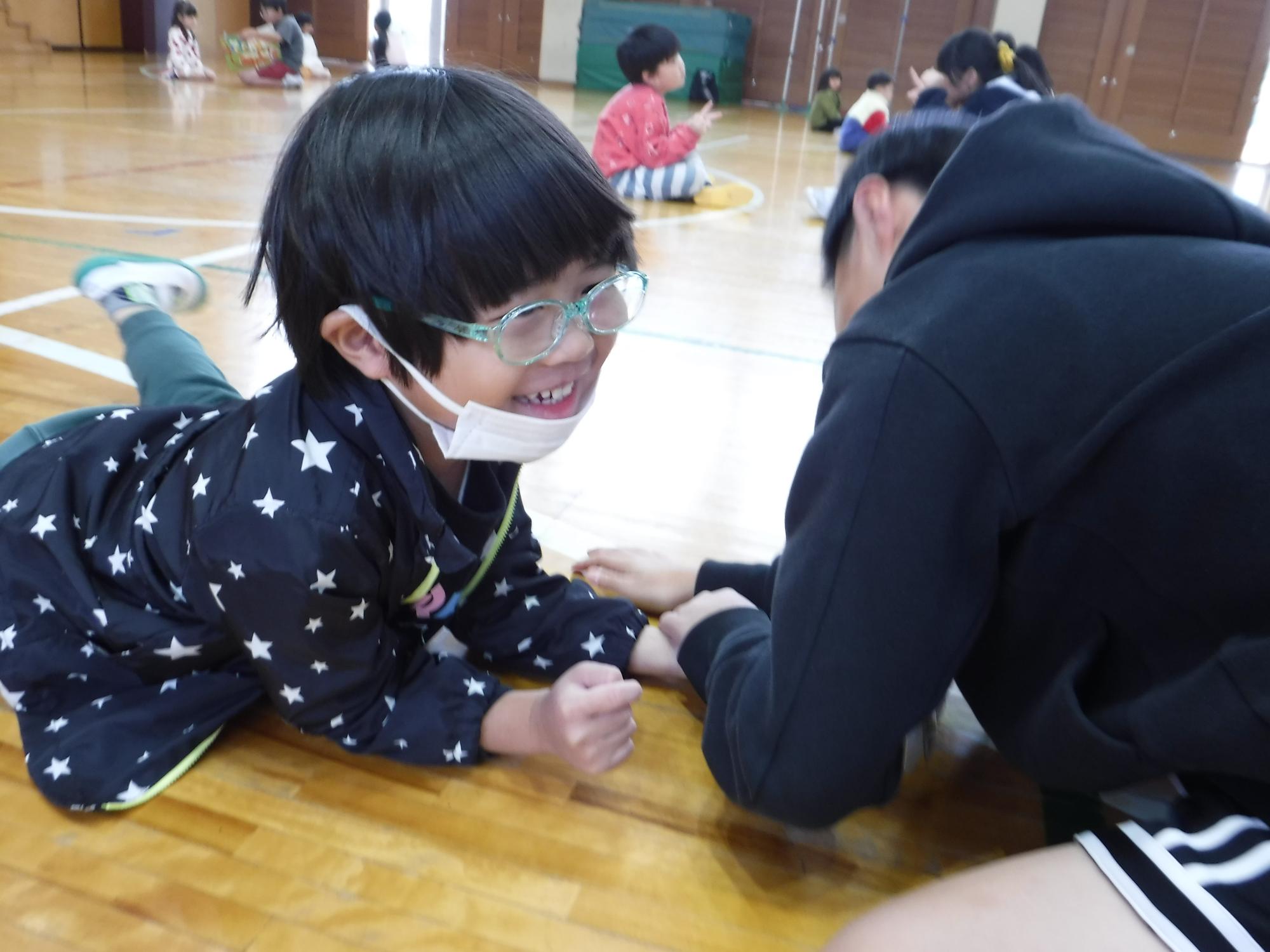 絵本を早く読み終えた園児たちに、じゃんけんや手遊び、腕相撲をして楽しませてくれました。最後には「来年会おうね!」と声をかけてもらいました。1年生になるのが楽しみですね。
