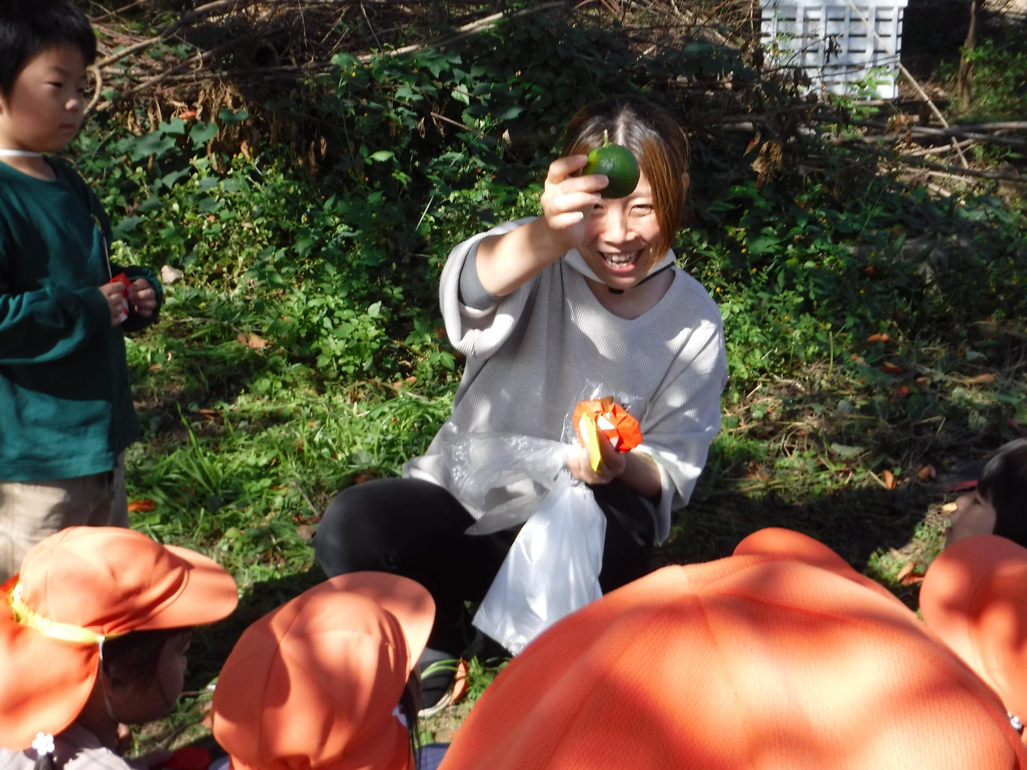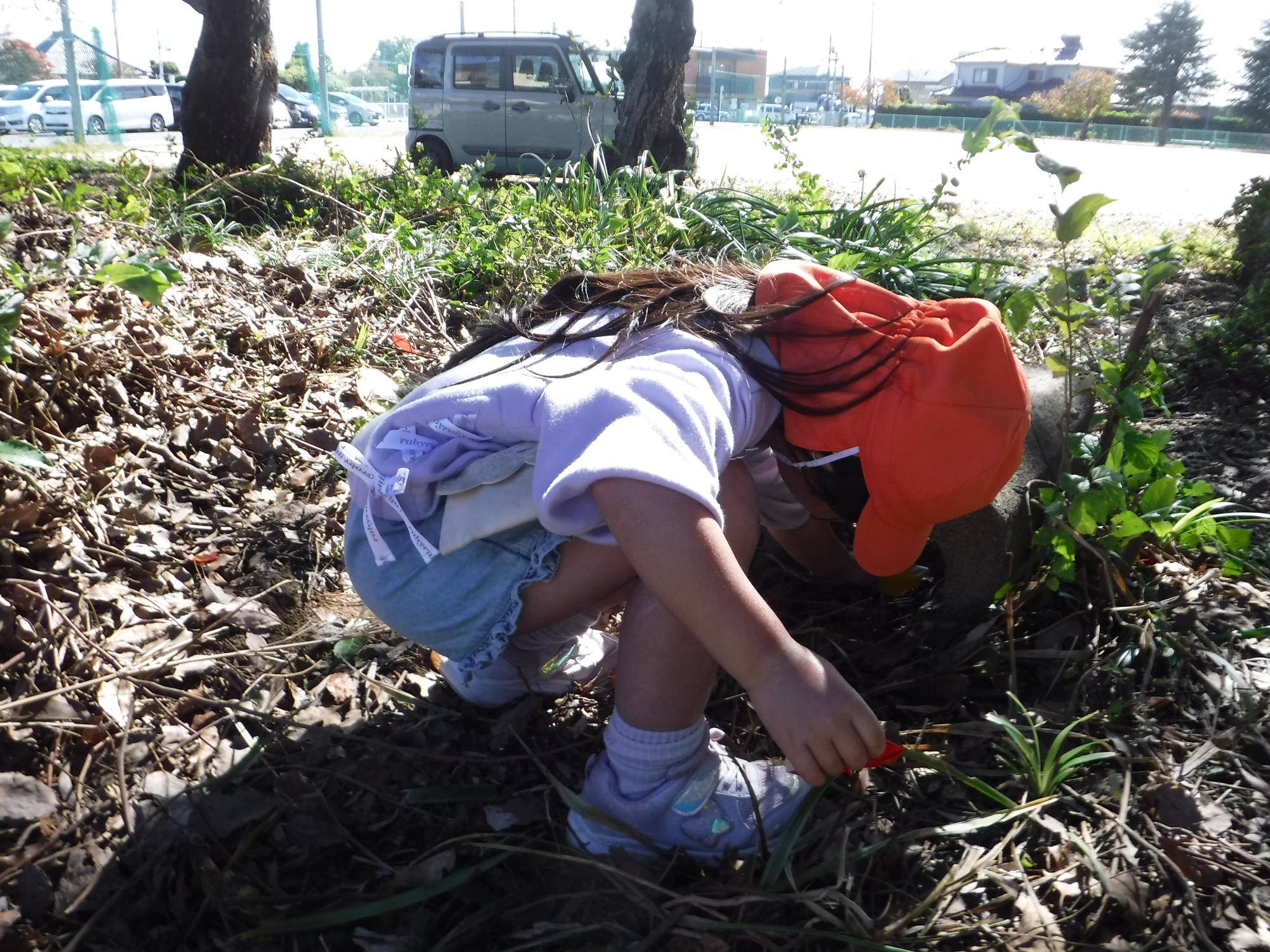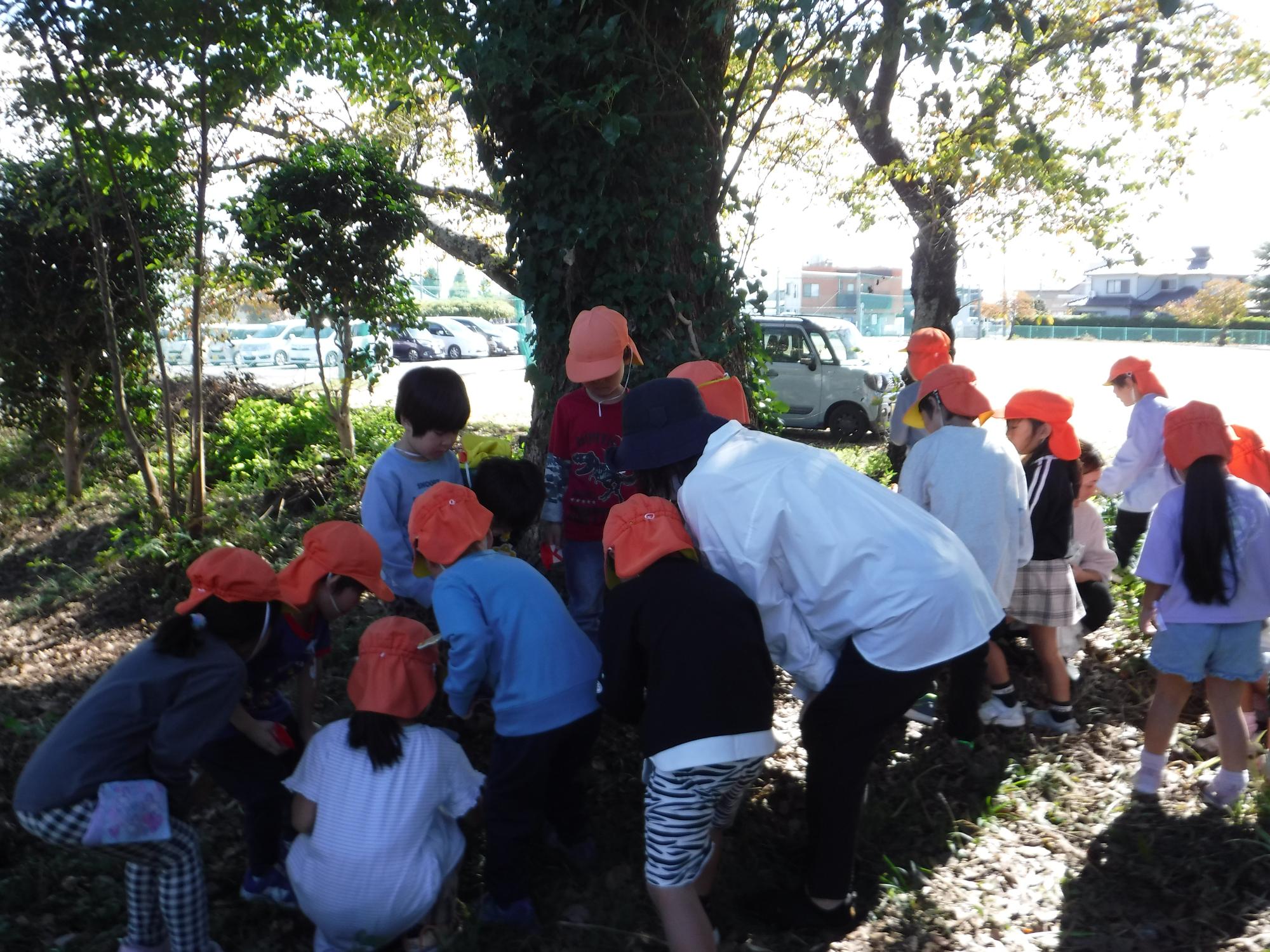 きのこ以外に、何を見つけたかな?の問いに、虫やミカンのような果物が生っているのを見つけた友達がいました。森の中は、木漏れ日がさし、さわやかな風が、とても気持ちよかったです。地面も落ち葉でふかふかとしていて、楽しい発見がたくさんありましたね。