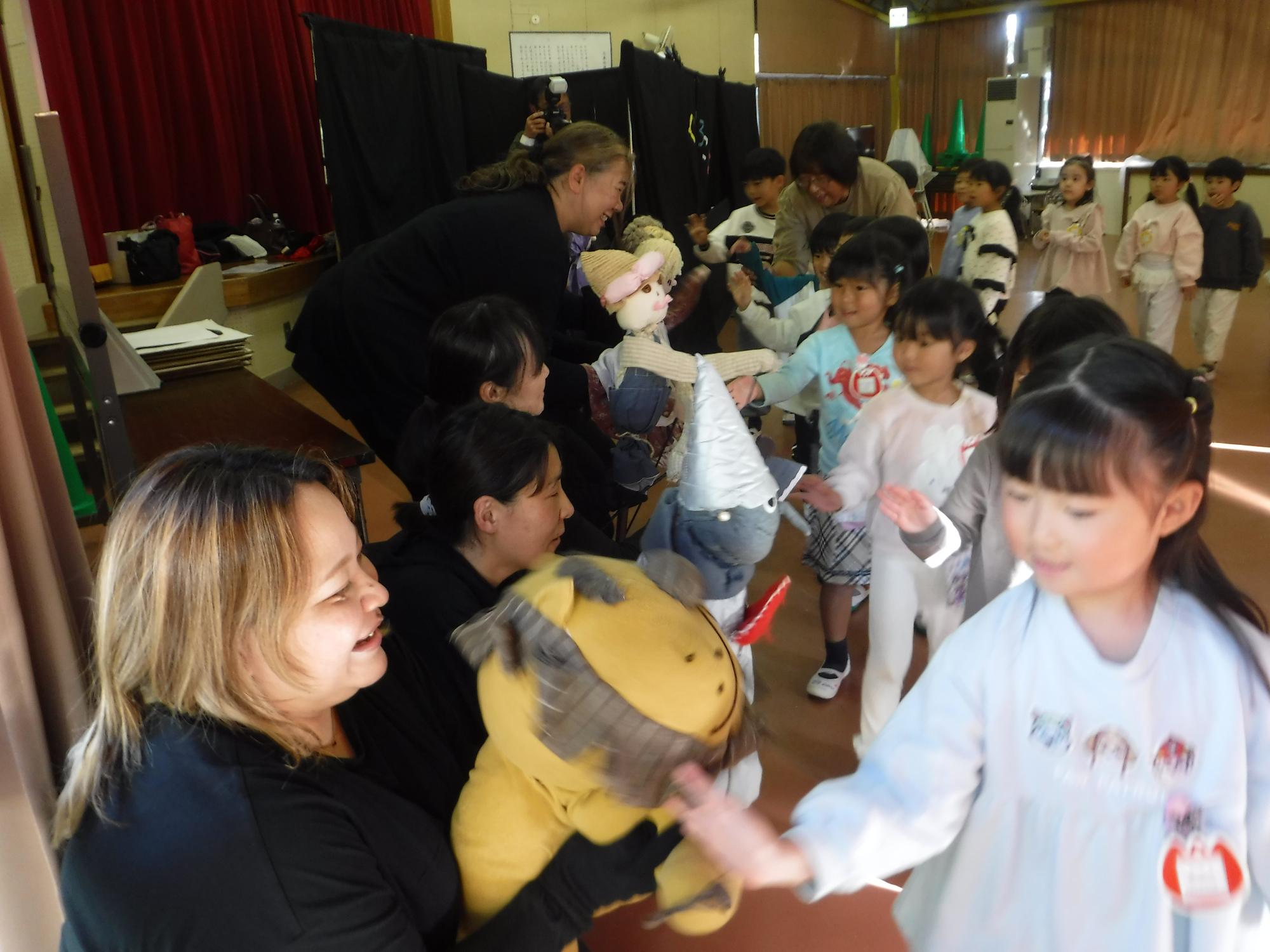 「オズの魔法使い」の人形劇を観ました。かかしの歩く姿に笑いが巻き起こったり、魔女との戦いでは、「ドロシー頑張れ!」と、真剣に見入ったりする姿が見られました。