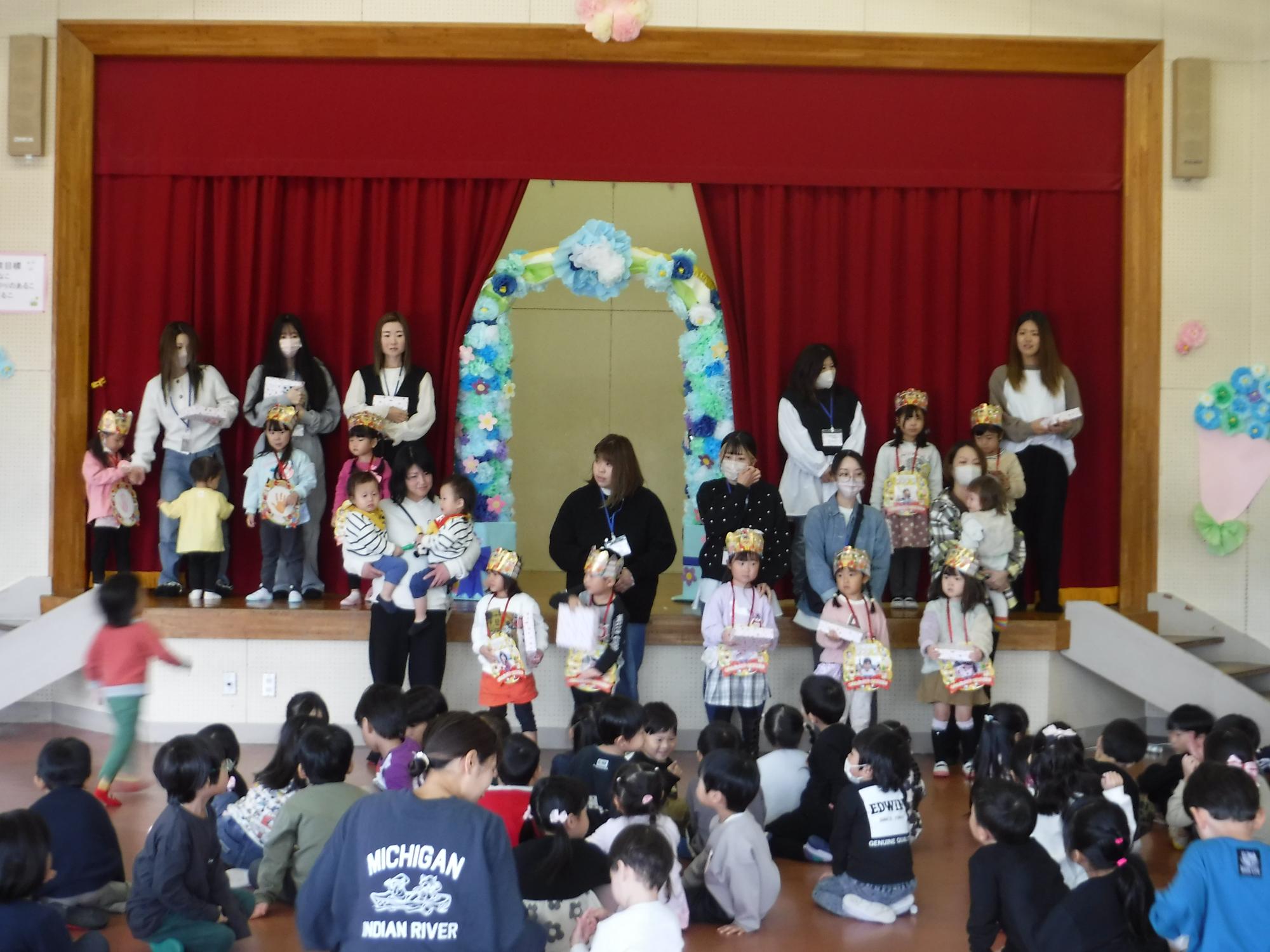 教師と一緒に「チューリップ」を歌いました。会場にかわいい手のチューリップがたくさん咲き、華やかな中、かわいい歌声が響きました。