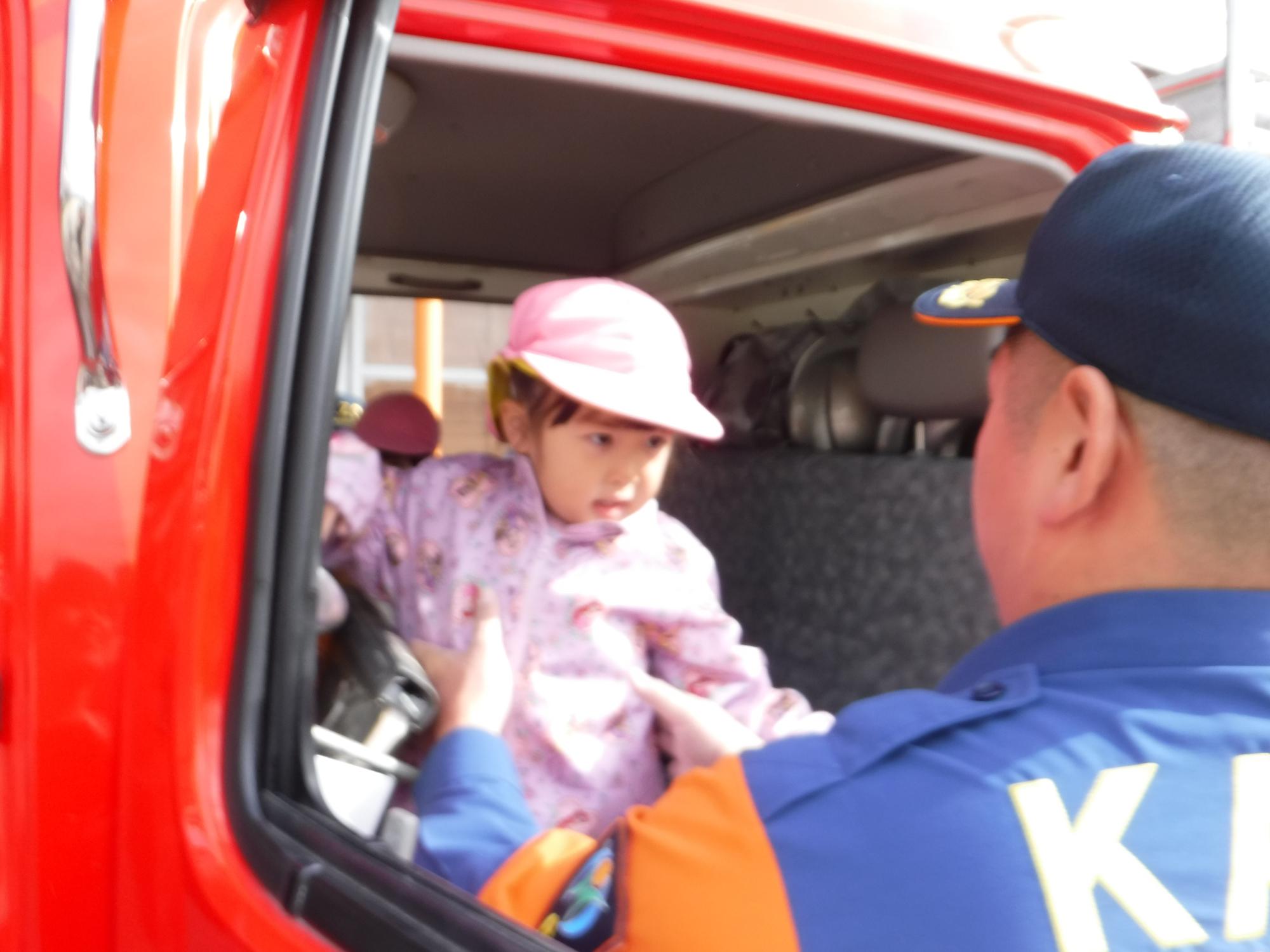 消防車にも特別に乗せていただきました。「消防士さん、かっこいいな!」こども達のハートに火がついたようです。