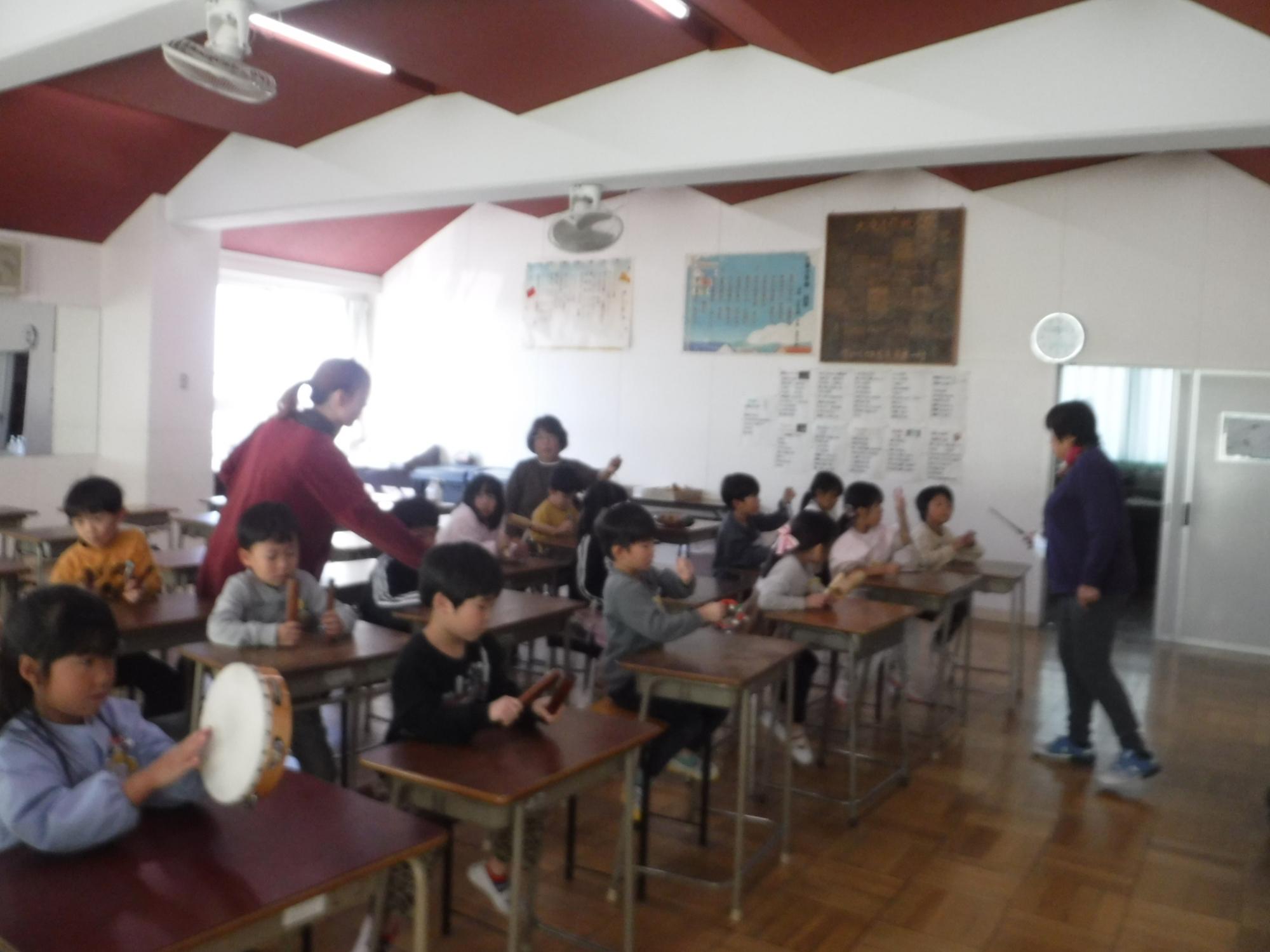 音楽室で、歌や楽器に触れて授業体験をしました。
