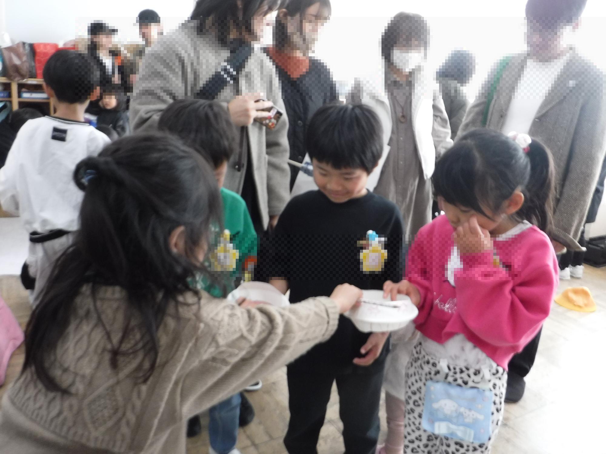 「熱いから気を付けてね。」年長さんが、口に運んであげています。(りす組)