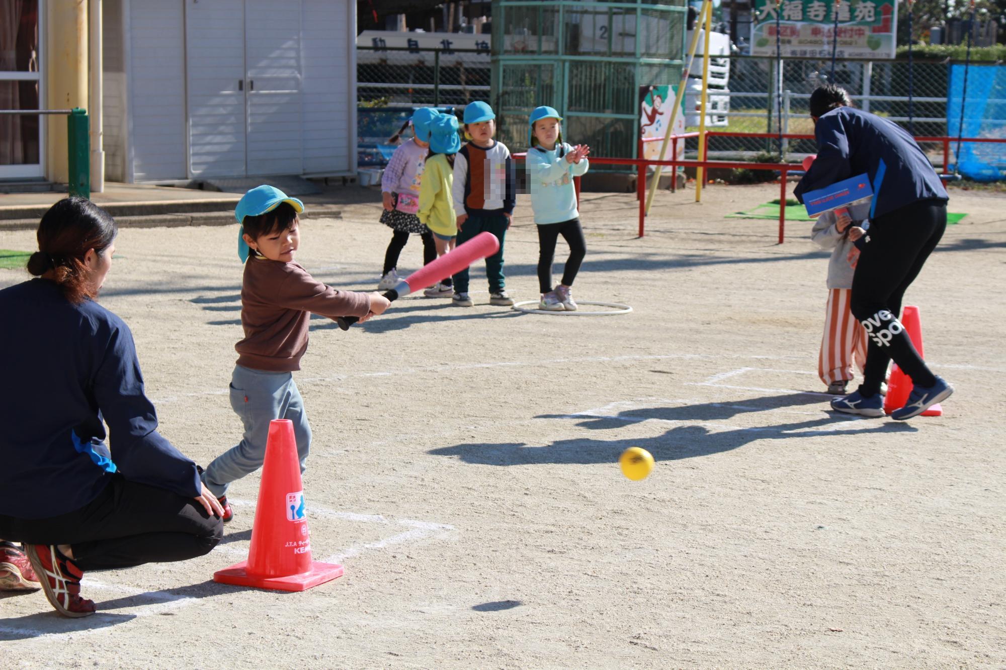 ティーバッティングでボールを打つのが楽しく、何度も繰り返し楽しんでいました。