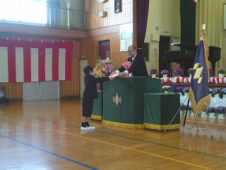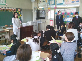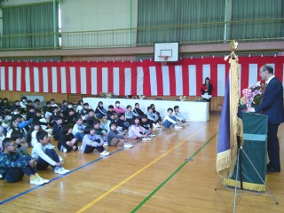 式では、たくさんの方からお祝いのことばをいただいたり、代表児童が校長から教科書を受け取ったりしました。