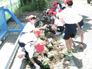みんなで協力して、ニチニチソウを丁寧に植えることができました。
