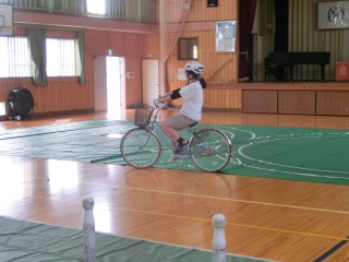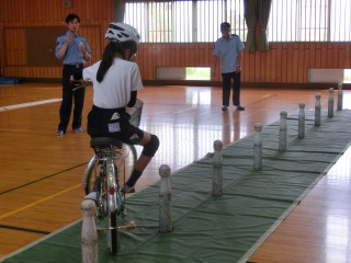 事前にテキストブックで学んだ「正しい自転車の乗り方」に基づき、実技試験を行いました。