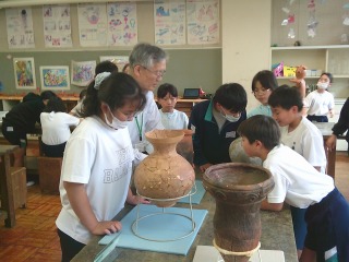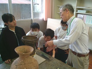 こどもたちは縄文時代や古墳時代の本物の土器に触ったり、講師の方の解説を聞いたりして、古墳時代についての理解を深めることができました。