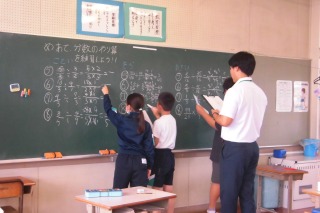 6年生の算数「分数×分数」の研究授業では、スモールステップで課題解決を行いました。「計算の途中で約分すると簡単」ということに気付き、どの子もたくさんの問題を解くことができました。