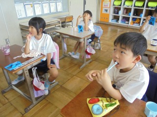 6月24日(火曜日)養護教諭が、1、2年生を対象に歯みがき指導を行いました。