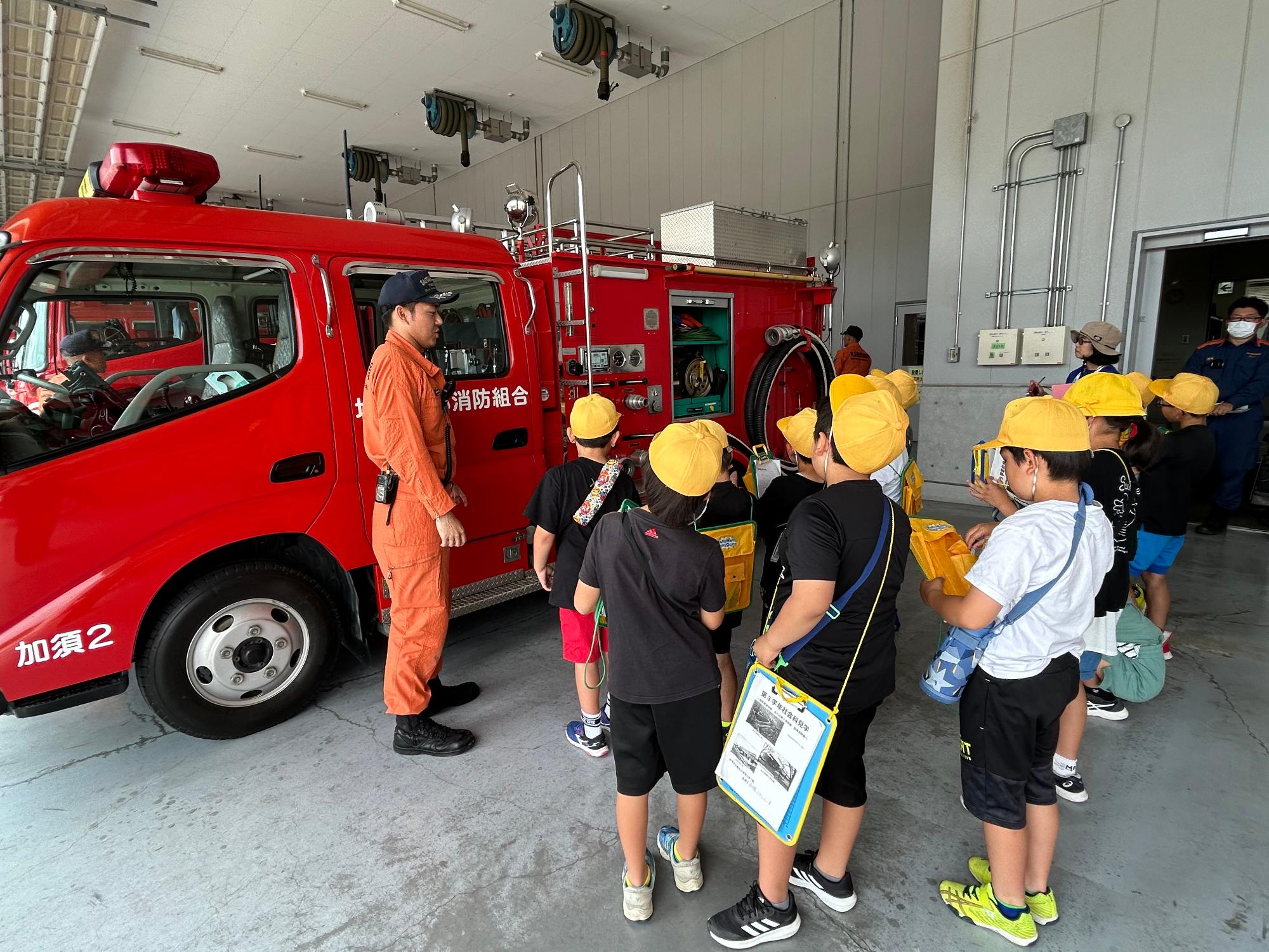 6月7日(金曜日)3年生社会科見学がありました。見学には快適な気候の中、渡良瀬遊水地・北川辺郷土資料館・加須消防署へ行きました。3年生は、社会で加須市の様子を学習したので、バスの中から加須市の街並みを見学しました。渡良瀬遊水地では体験活動センターで、遊水地について学んだ後、湿地を散策しました。郷土資料館では、昔の道具を見学しました。午後は、加須消防署の施設や色々な種類の消防車を見学しました。