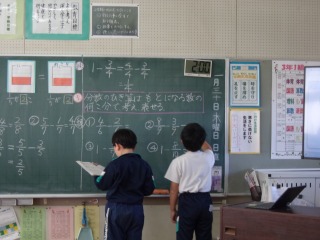 5校時には、3年1組で研究授業を行いました。児童は、この時間の学習課題「分数でもひき算ができるか考えよう」を解決するために、これまでの学習を応用しながら学びを深めていました。授業の後半では、学級全体で確認した計算方法を使って、多くの問題を解くことができました。